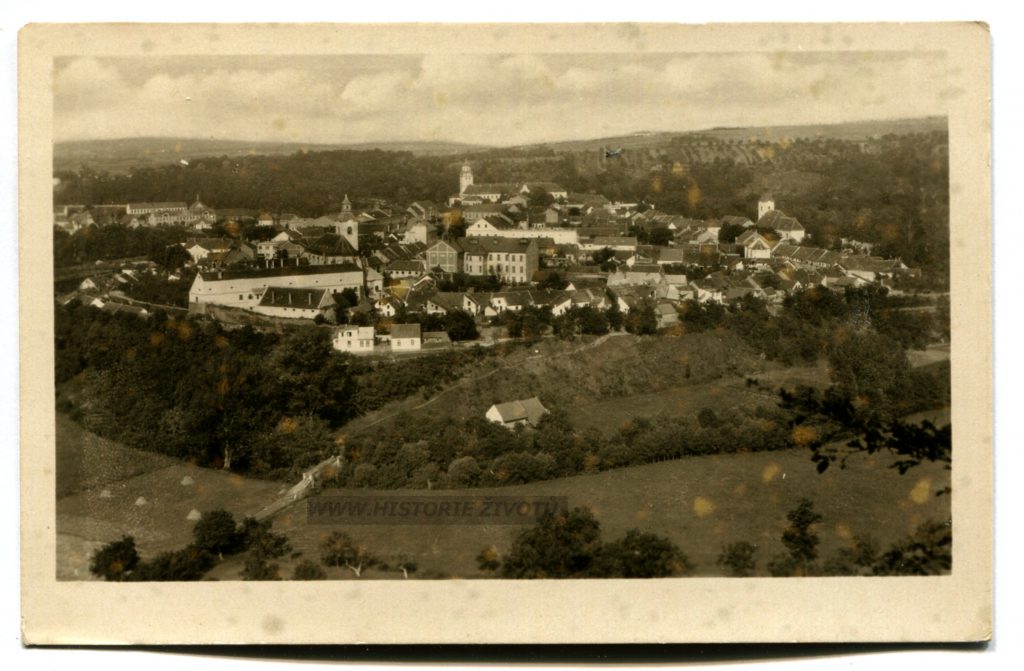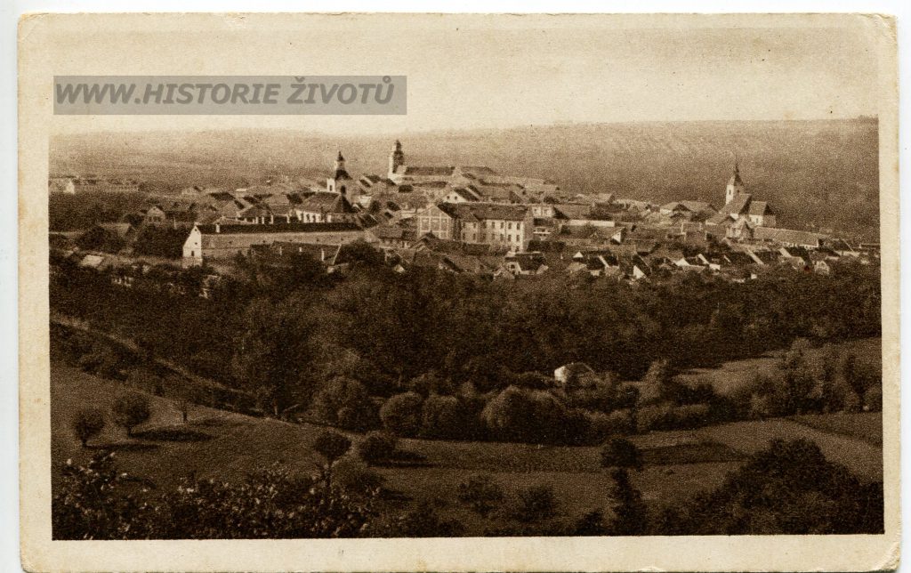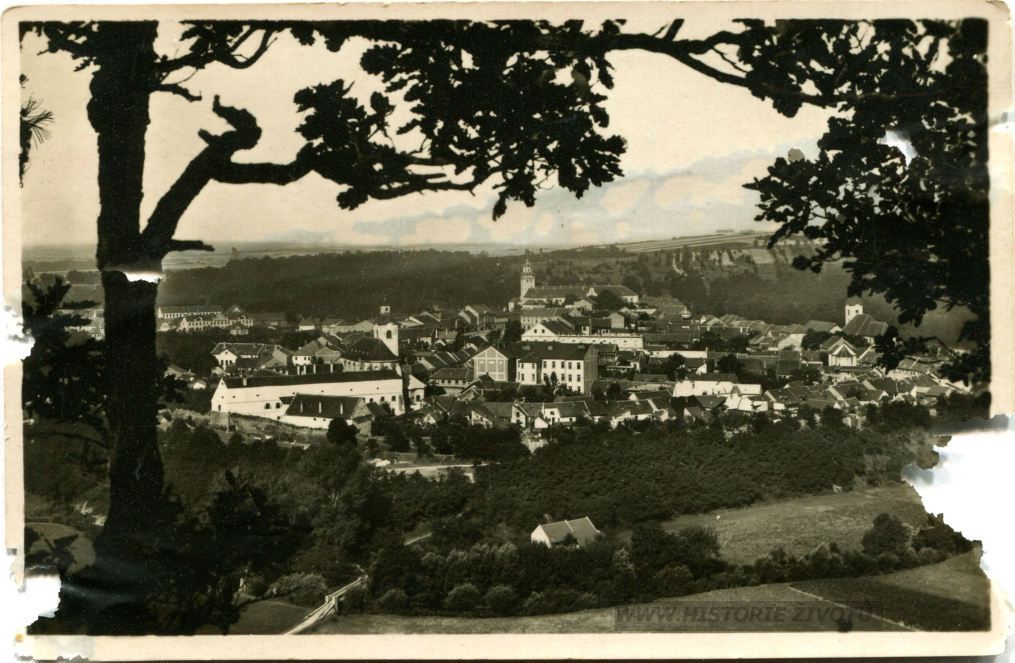 Staré pohlednice Moravského Krumlova – pohled ze skal mezi Floriánkem a Křižákem