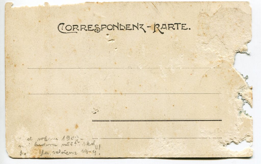 Popis: Na zadní straně napsal rukou EduardChvátal: „před rokem 1908 – není budova měšť.škol, ??? byla založena 1909.“