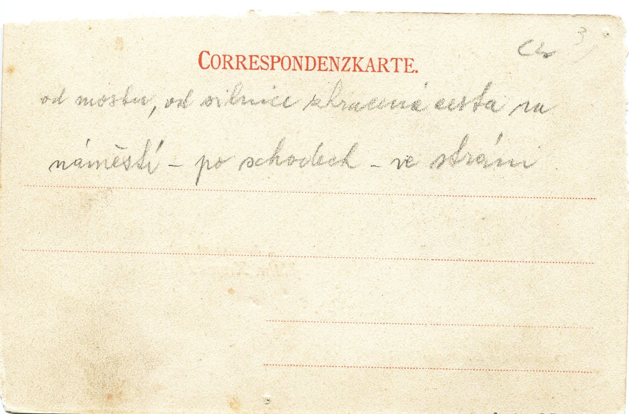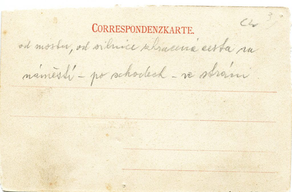 Na zadní straně napsala rukou E.V.-Ch.: od mostu, od silnice zkrácená cesta na náměstí – po schodech – ve stráni