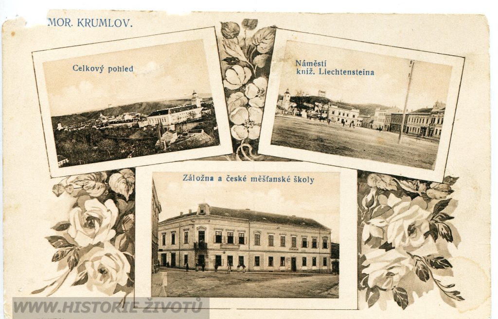 Obr.č.4,5 Moravský Krumlov – Celkový pohled, Náměstí kníž. Liechtensteina, Záložna a české měšťanské školy