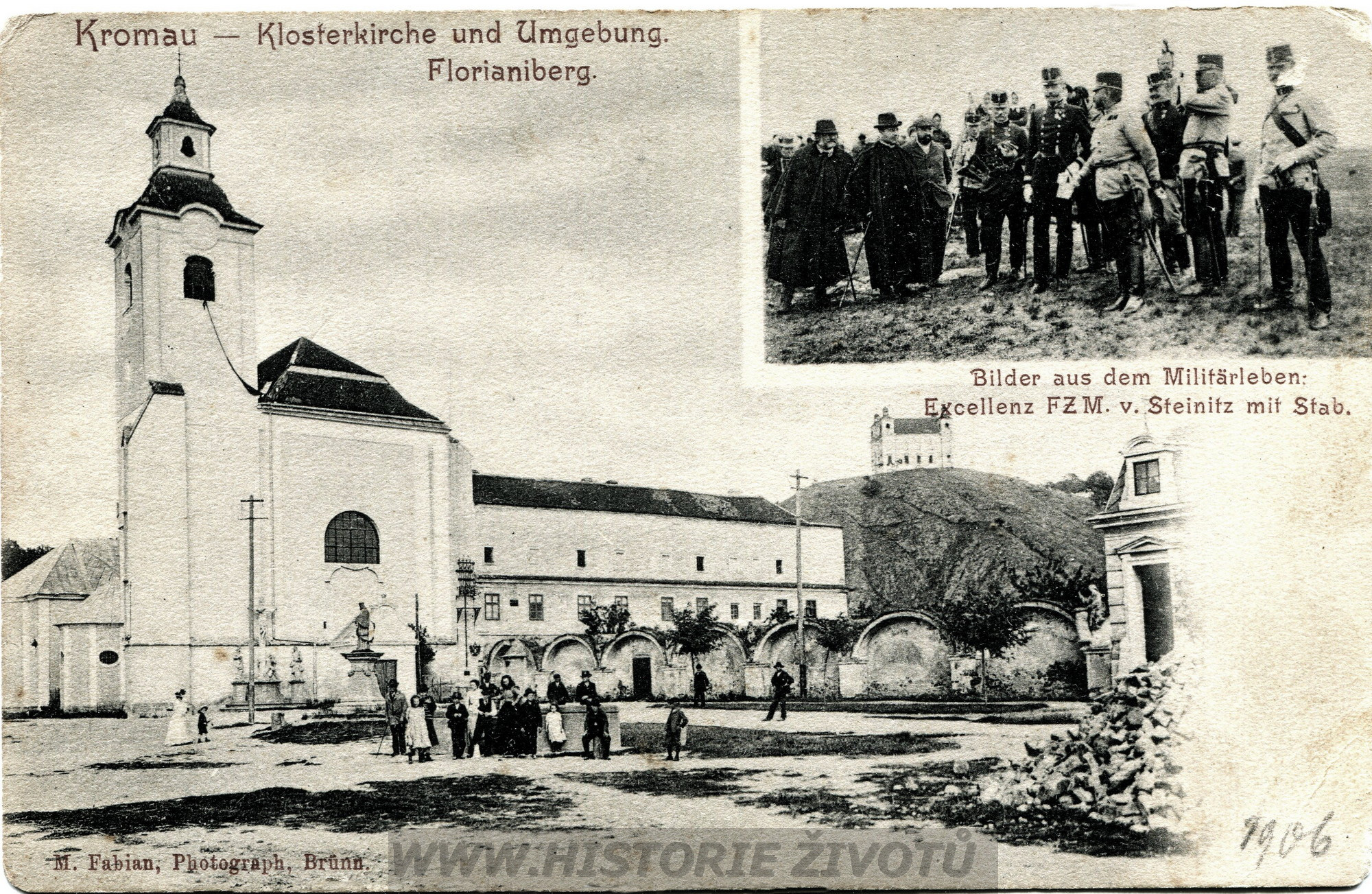Přední strana: Nápisy: „Kromau – Klosterkirche und Umgebung. Florianiberg.“ „Bilder aus dem Militärleben: Excellenz FZM. v. Steinitz mit Stab.“ „M. Fabian, Photograph, Brünn.“