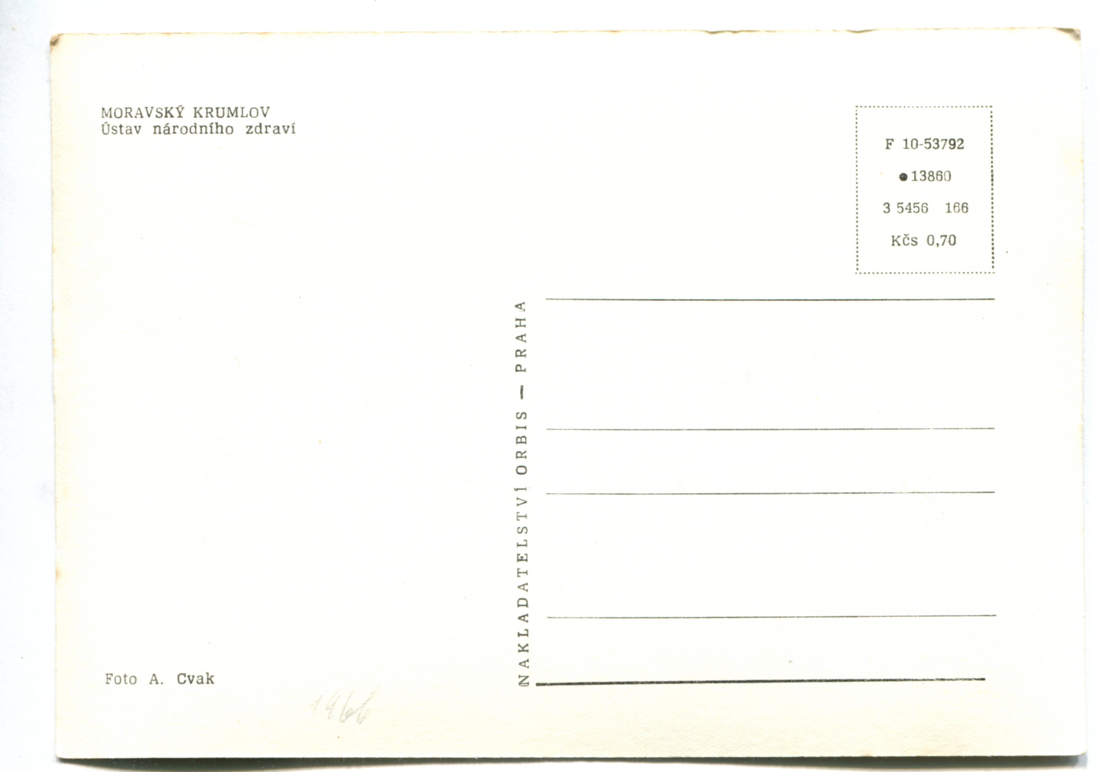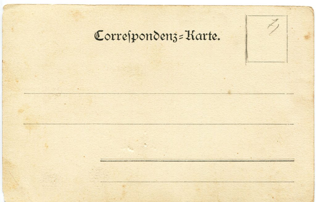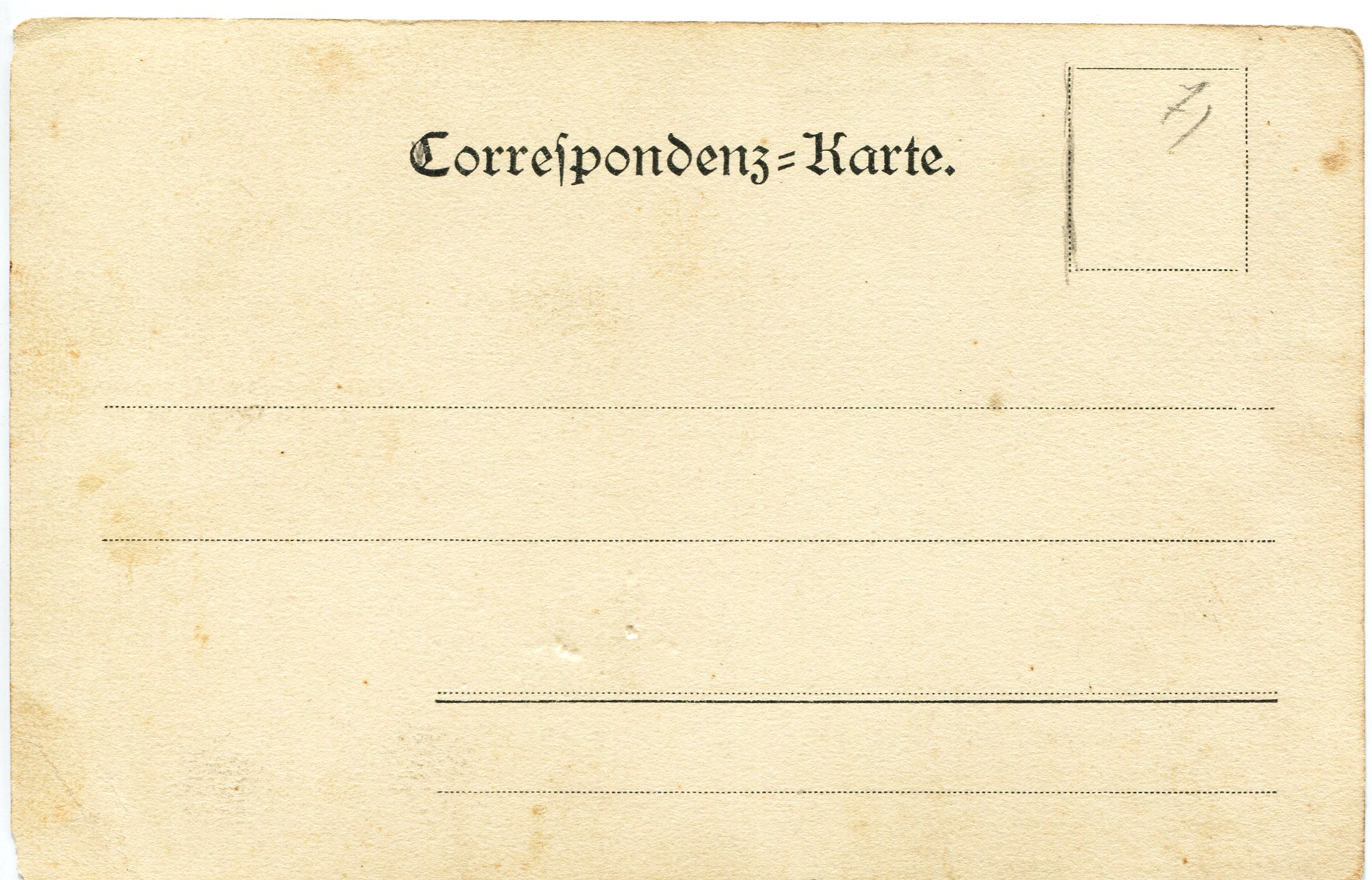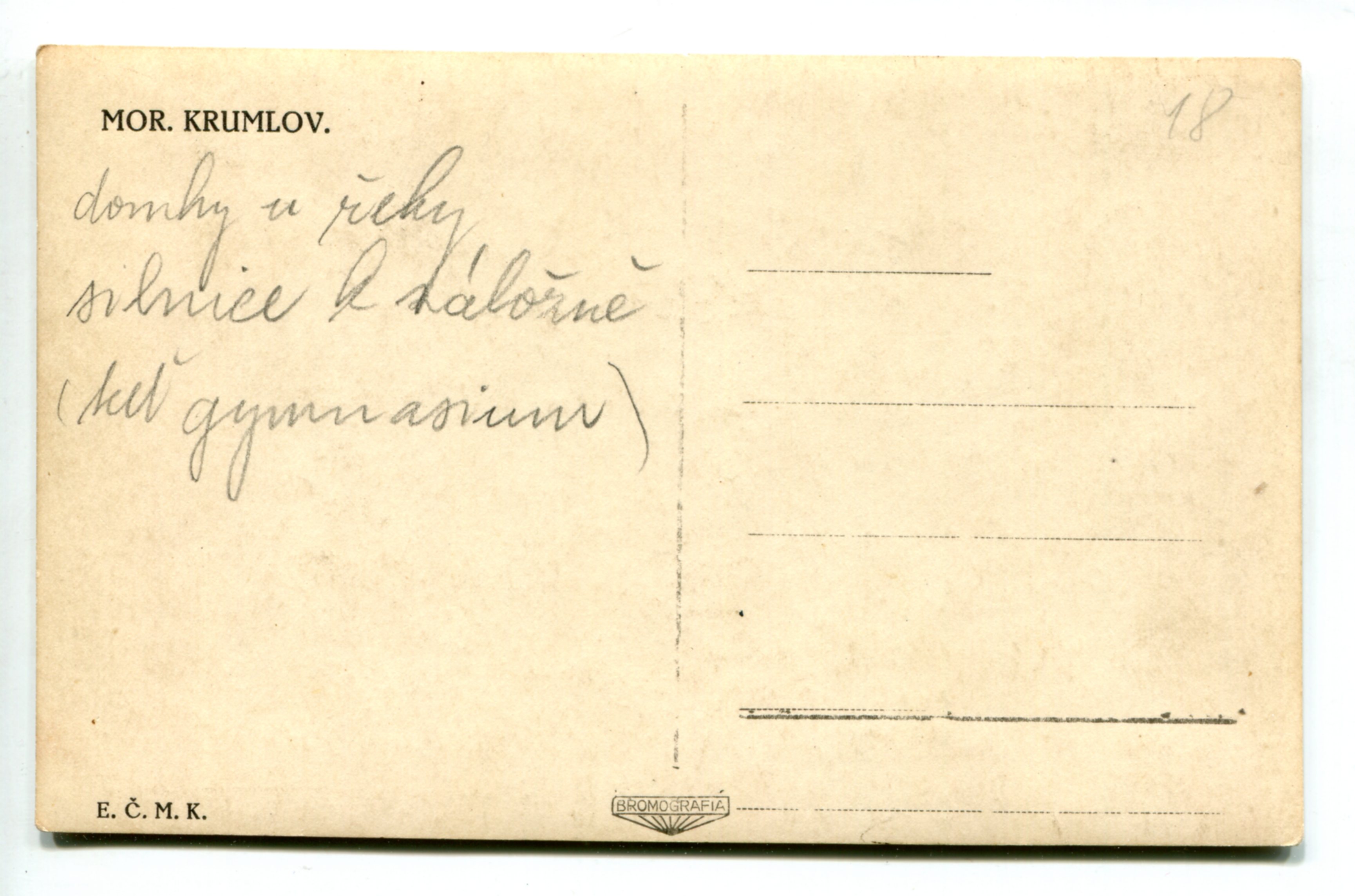 Na pohlednici jsou zaretušované původní německé nápisy – Emilie V.-Ch. jako učitelka používala tyto pohlednice ve škole v polovině 20. století a tak tam nemohly být německé nápisy.
