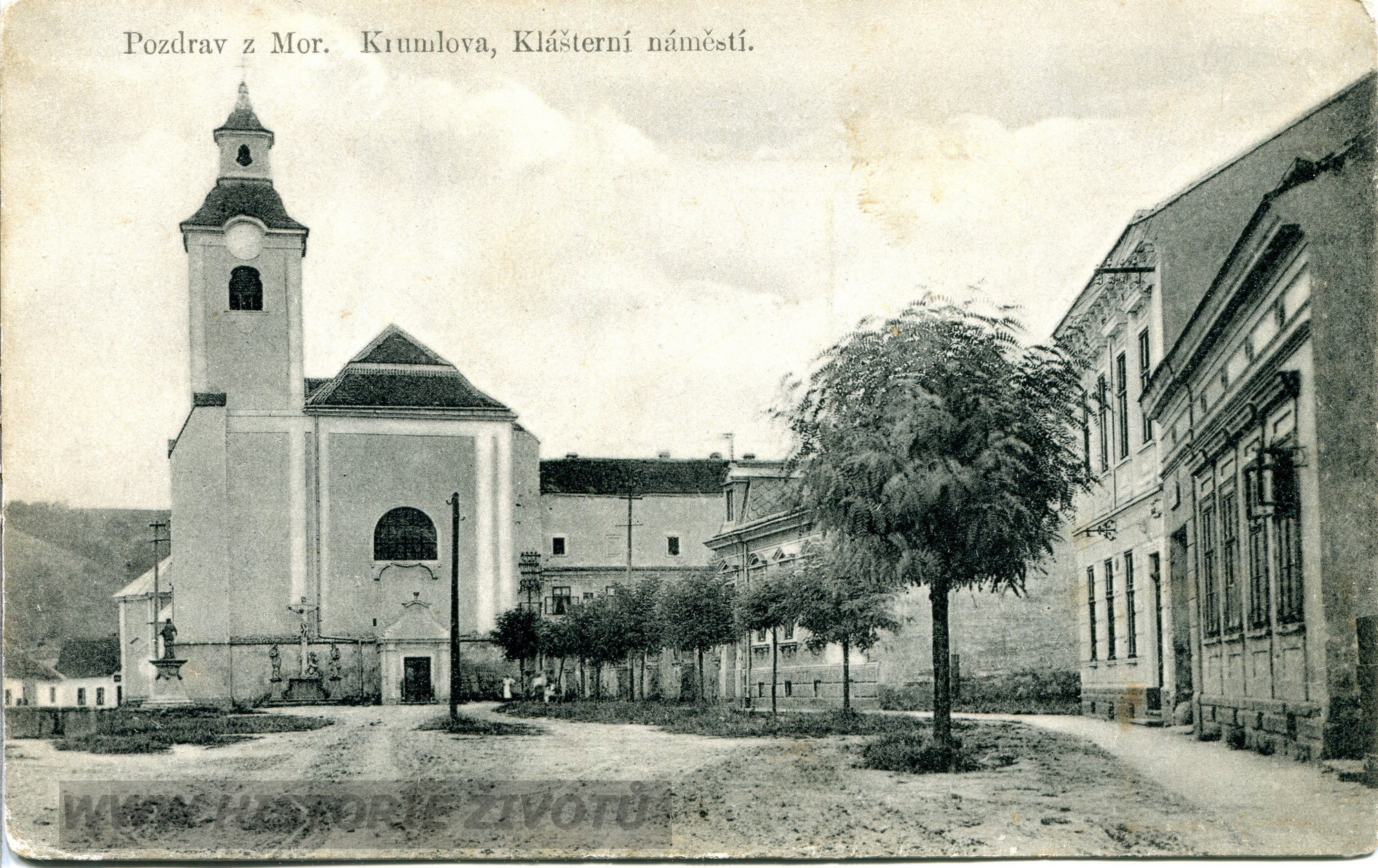 Popis: Na pohlednici je vidět před klášterním kostelem socha sv. Jana Nepomuckého, před ní kašna. Lipová alej, zmiňovaná v Krumlov před léty, tam v této době není.