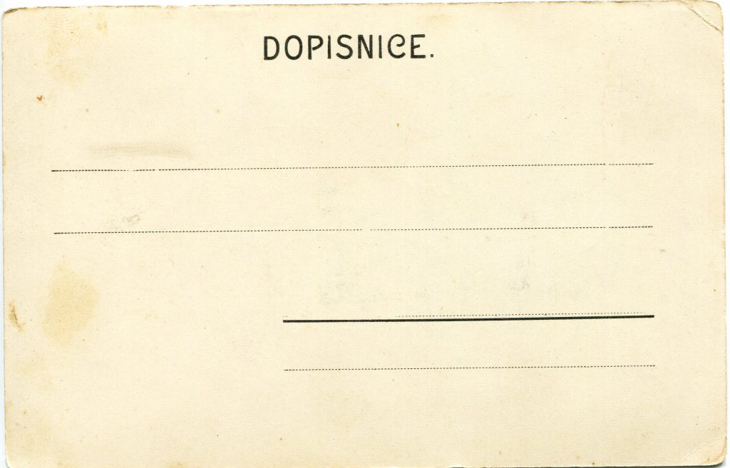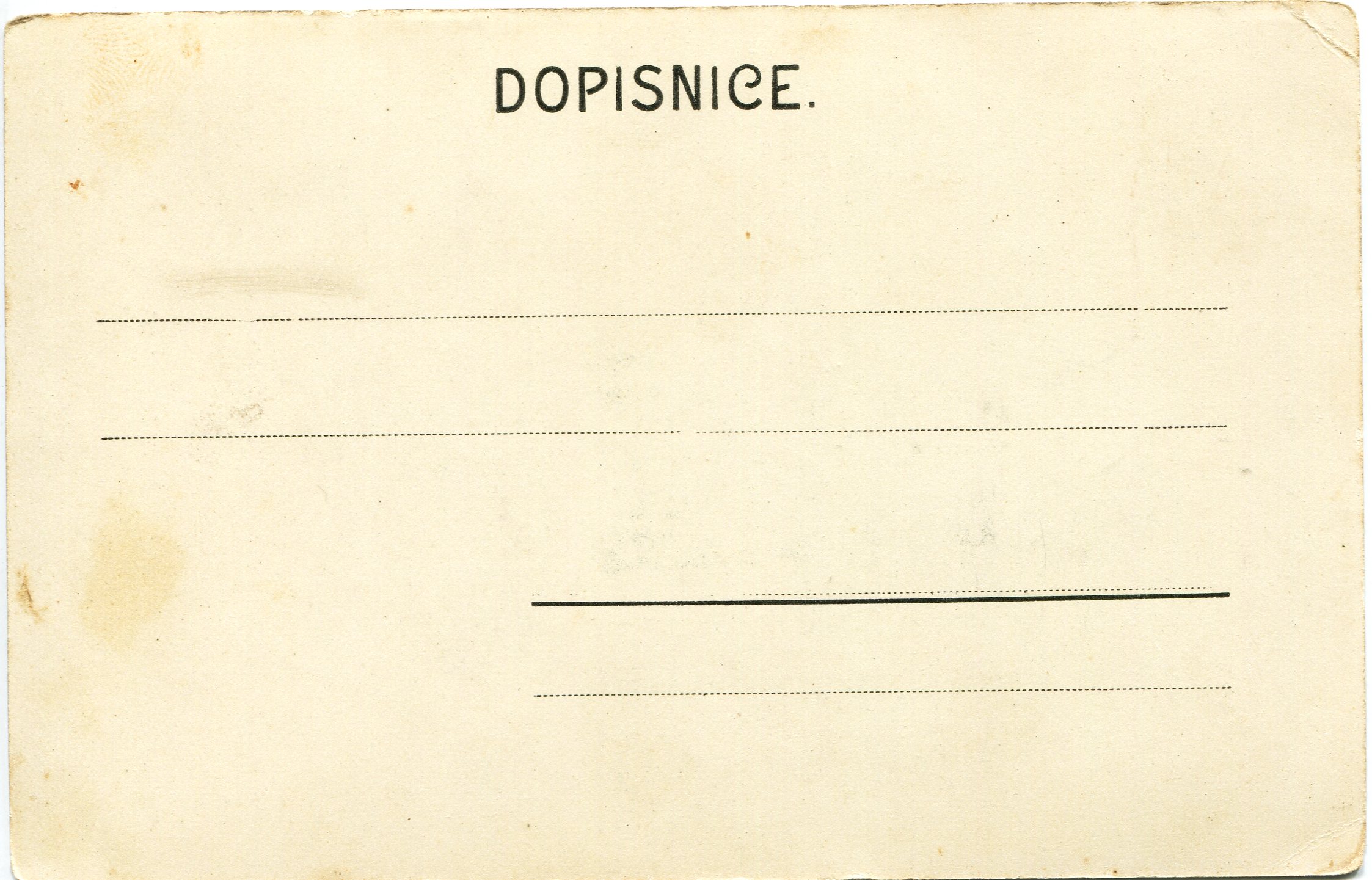 Popis: Na pohlednici jsou původní německé nápisy zaretušované – Emilie V.-Ch. jako učitelka používala tyto pohlednice ve škole a tak tam nemohly být německé nápisy.