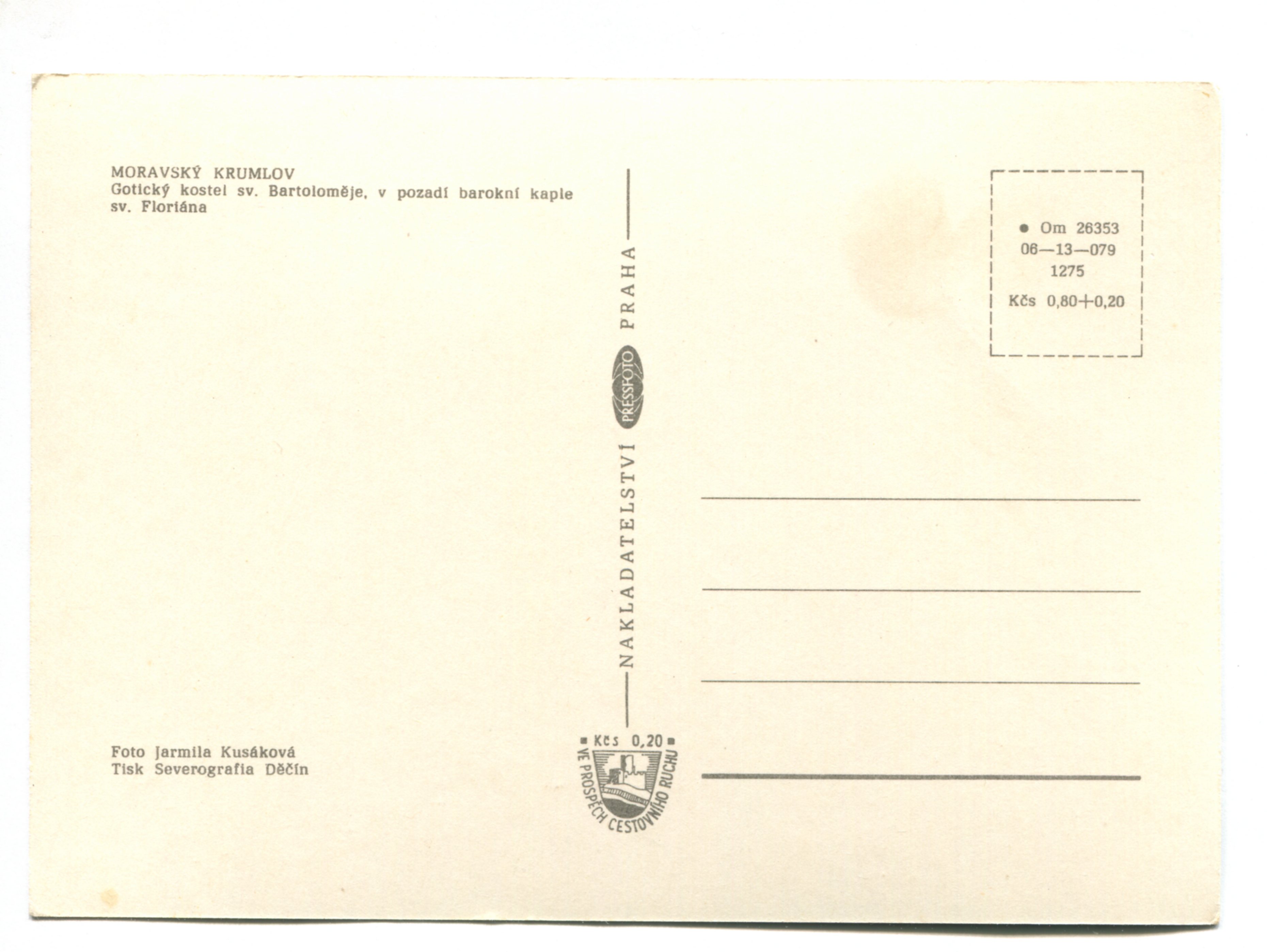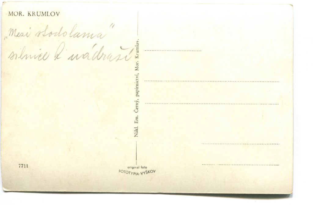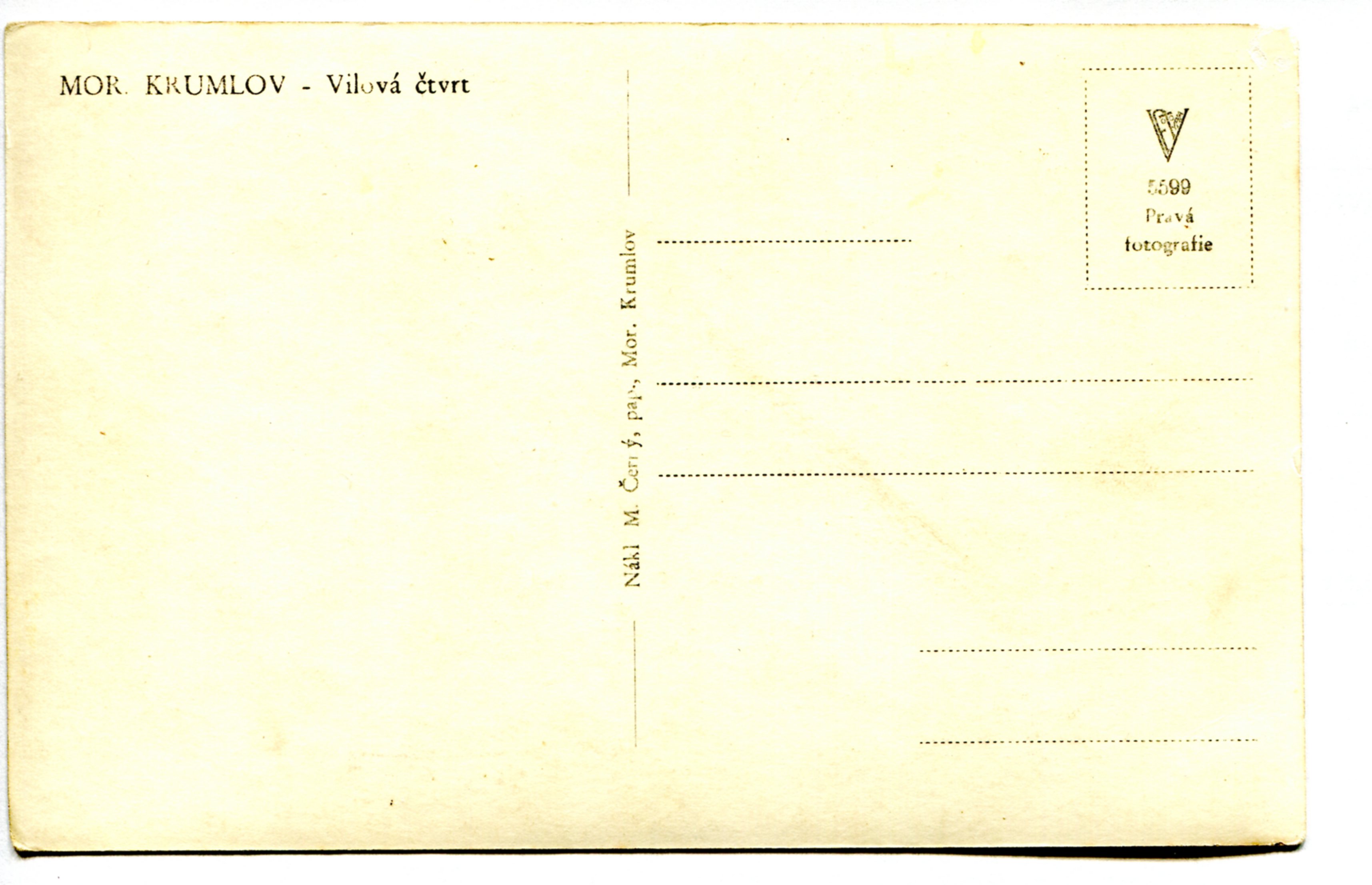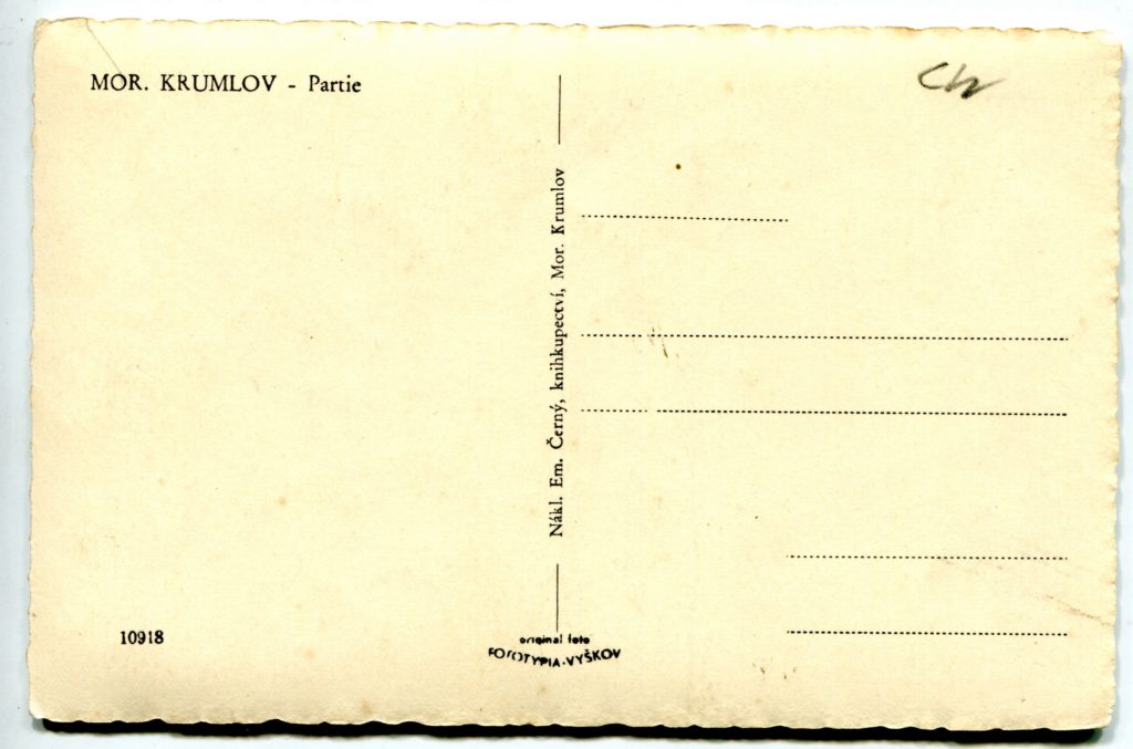 Zadní strana (Obr.č.41): Nákl. M. Černý, pap., Mor. Krumlov místo známky znak FTV 5599 Pravá fotografie (FTV je znak Fototypie Vyškov) (M.Černý je chyba vydavatele!! – patří Em.Černý)
