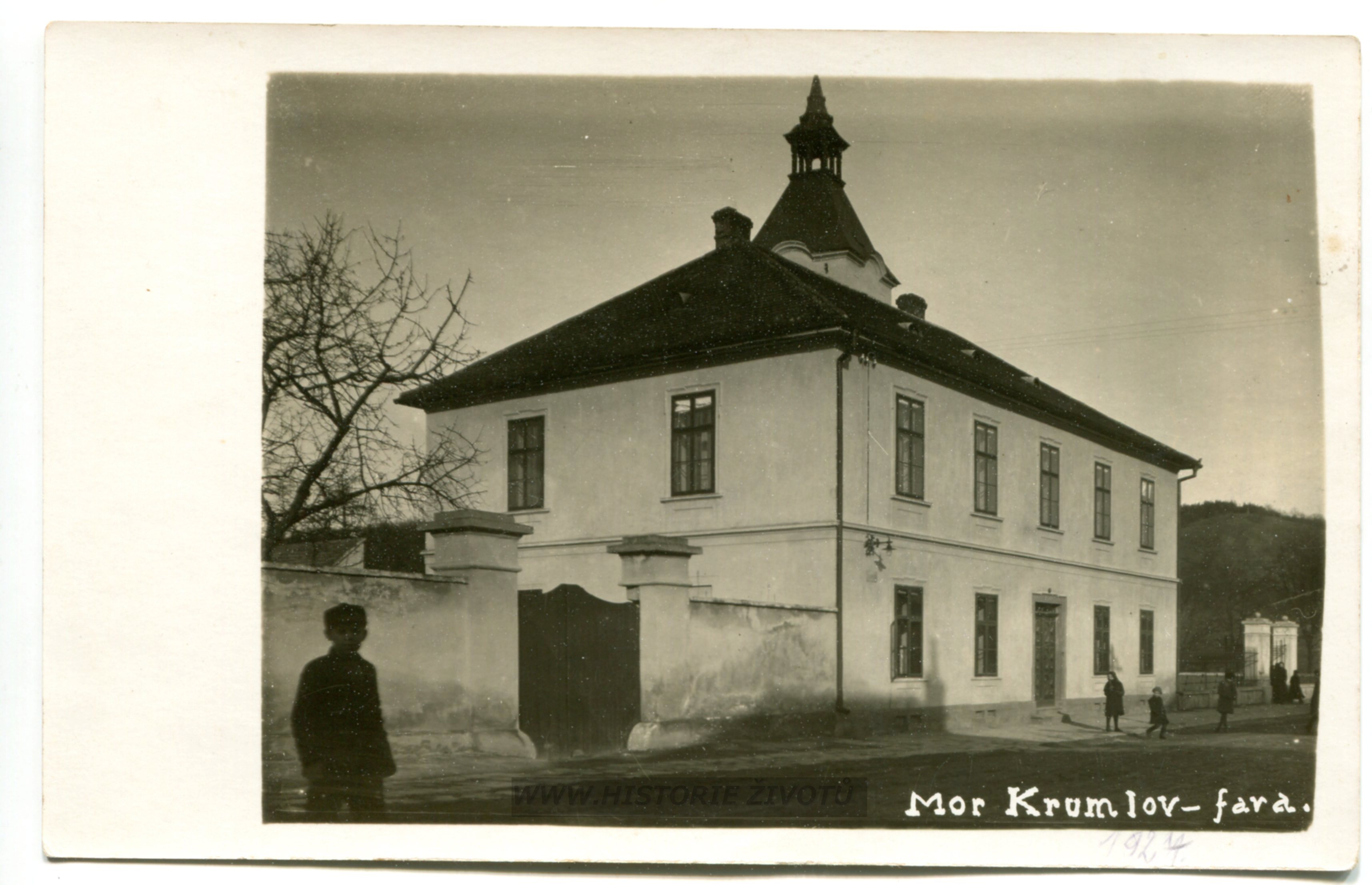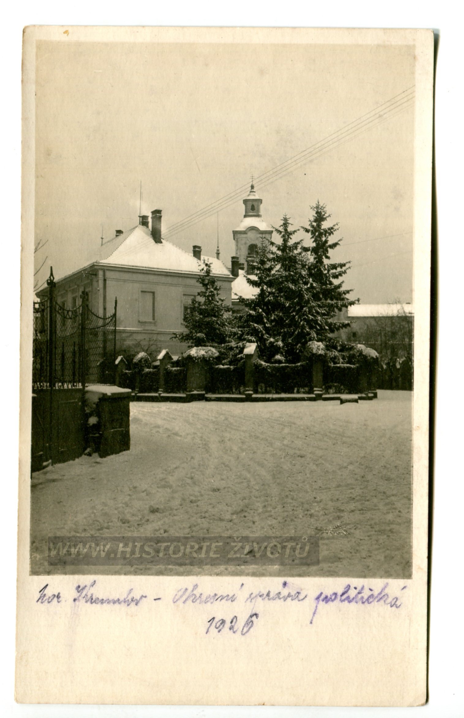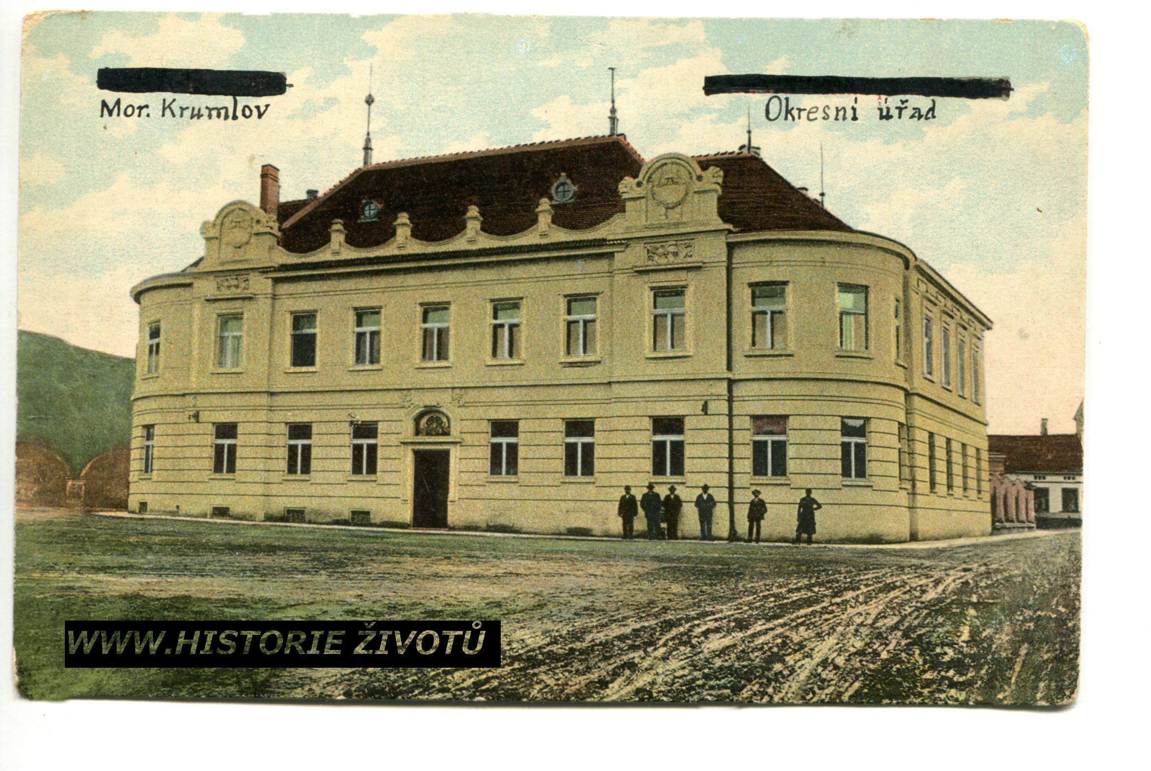 Stáří fotografie – na pohlednici dopsala rukou E.V.-Ch. „Mor.Krumlov – Okresní správa politická 1926“. Nadstavba 2.patra se uskutečnila 1936-37, takže je to možné.