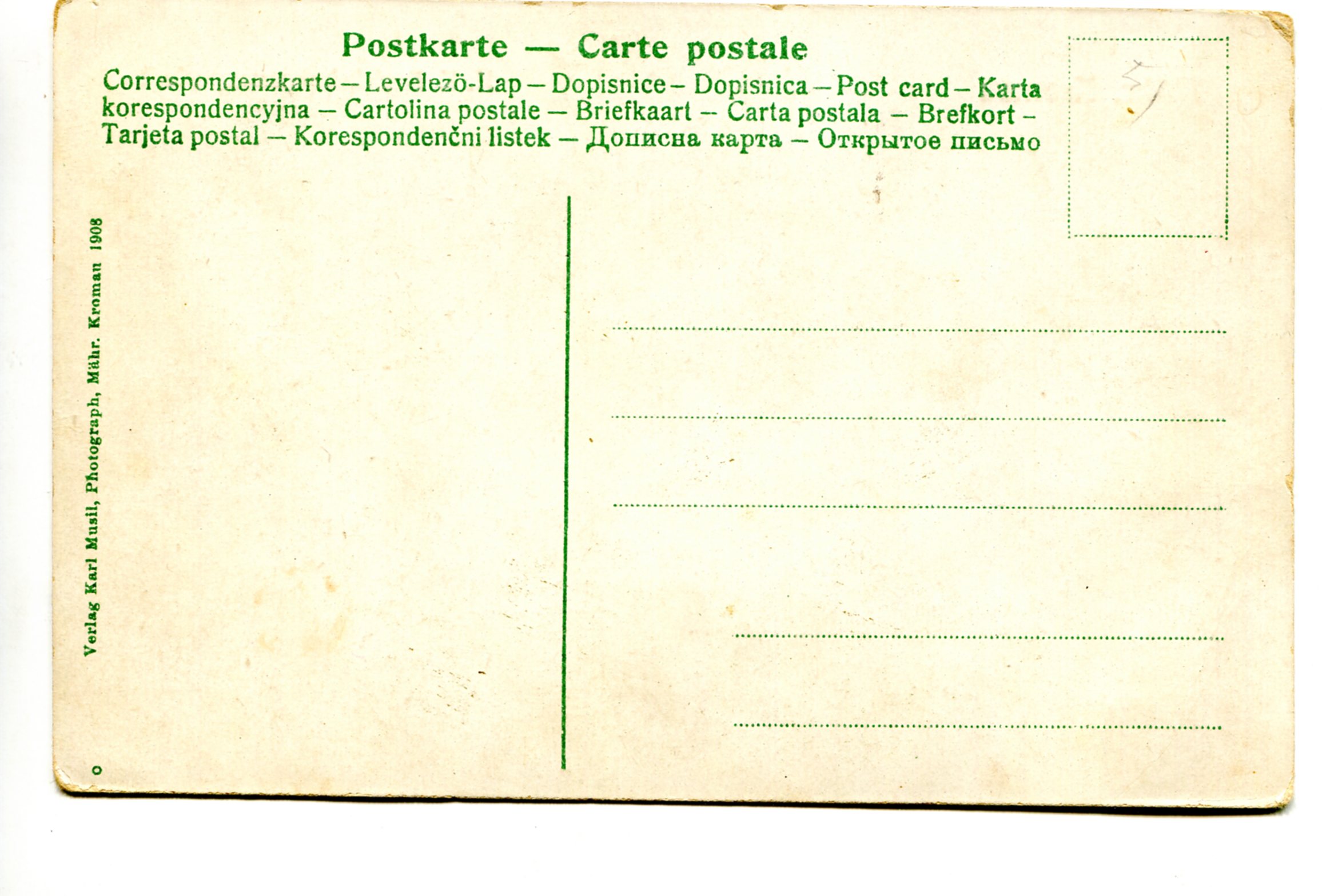 Zadní strana (Obr.č.15): Verlag Karl Musil, Photohraph, Mähr. Kromau 1908