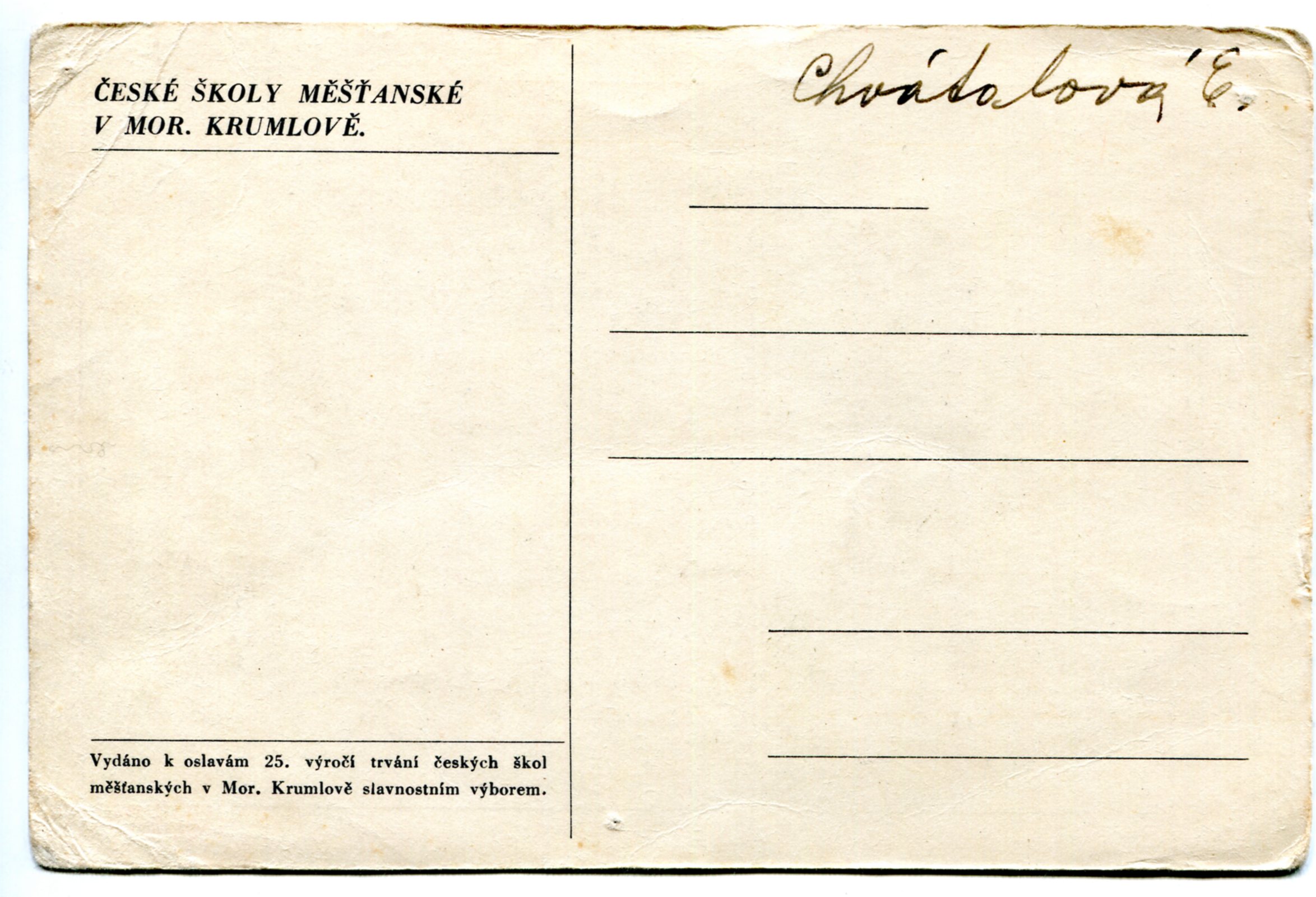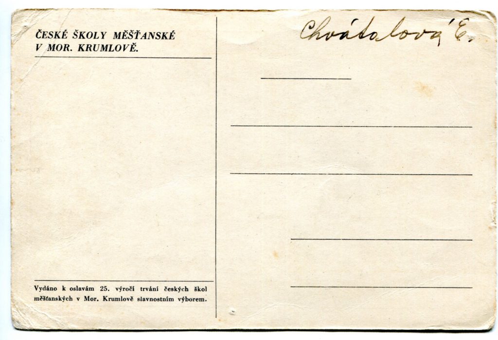 Zadní strana (Obr.č.21): „České školy měšťanské v Mor. Krumlově. Vydáno k oslavám 25.výročí trvání českých škol měšťanských v Mor. Krumlově slavnostním výborem.“