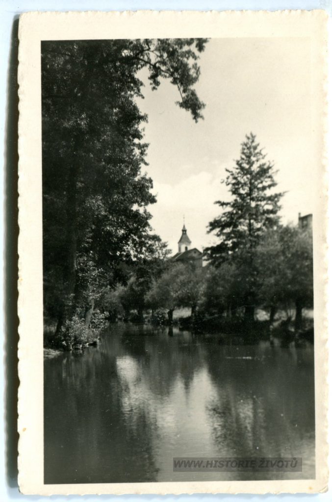 Obr.č.24,25 Moravský Krumlov – pohled na farní chrám Všech svatých od říčky Rokytné ve směru od splavu u Valdova mlýna