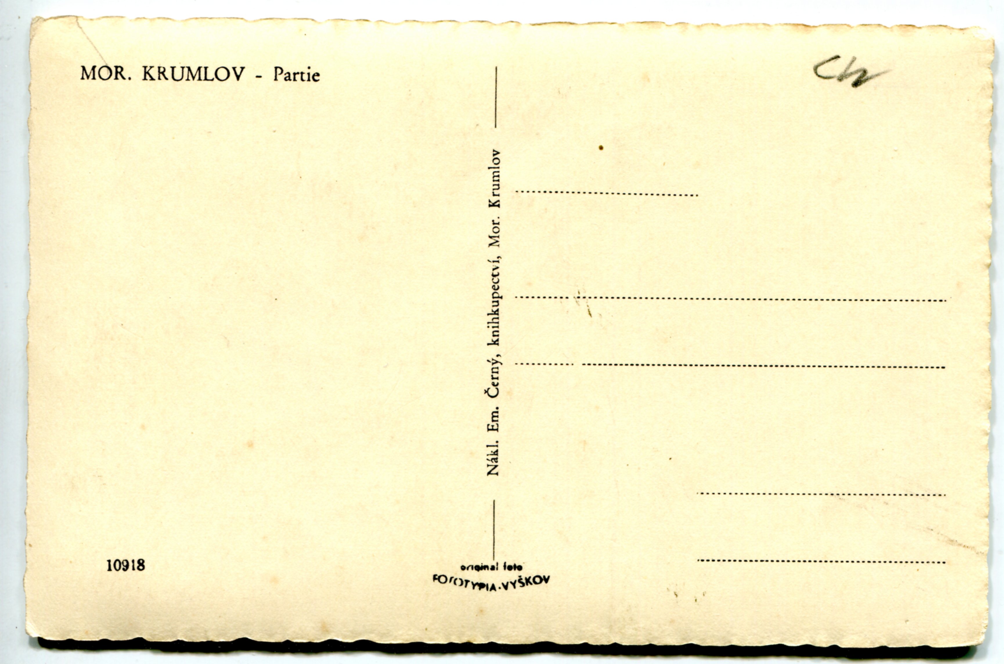 Zadní strana (Obr.č.19): Nákl. Em. Černý, knihkupectví, Mor. Krumlov Originalfoto Fototypia Vyškov 10924