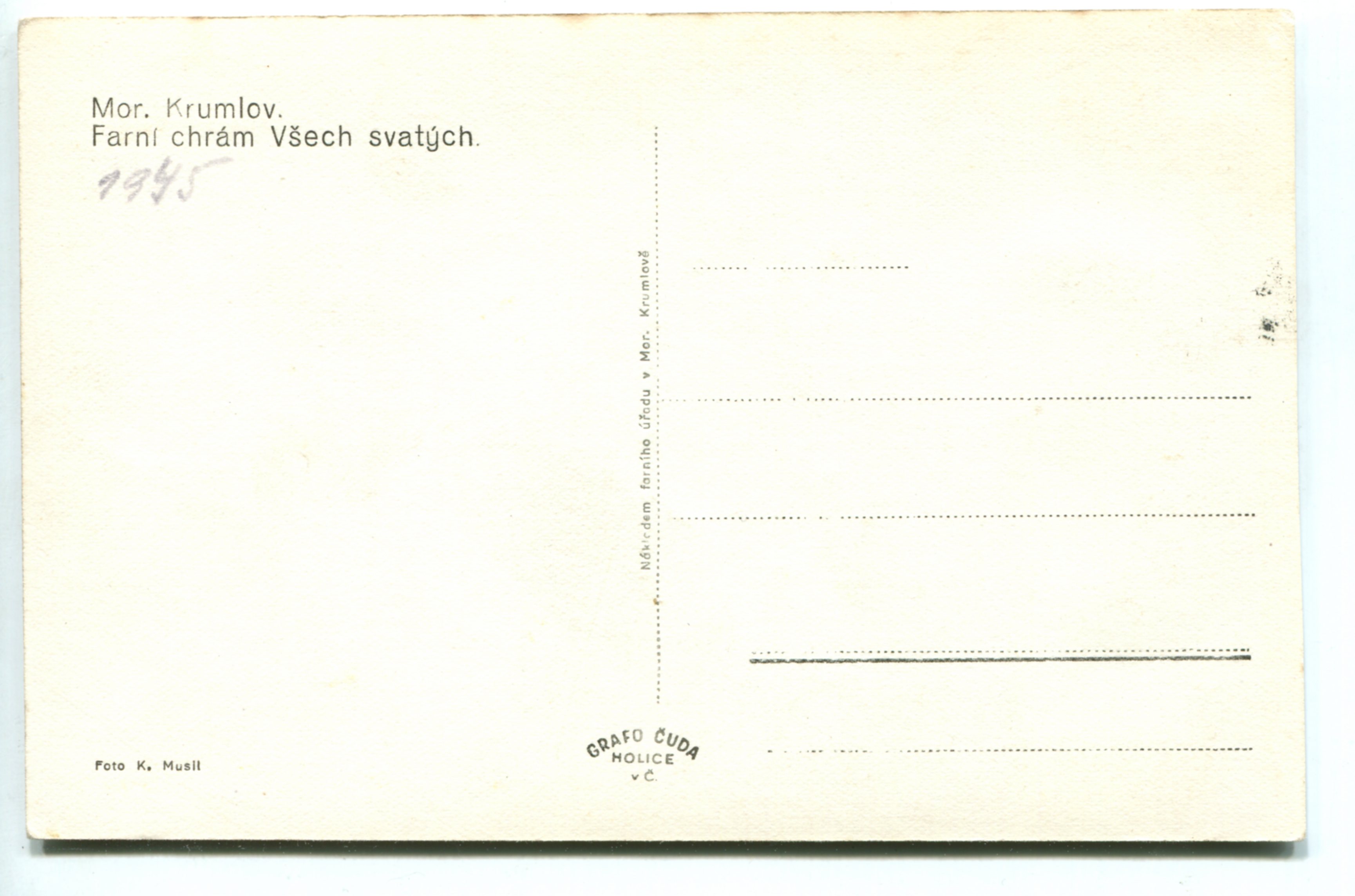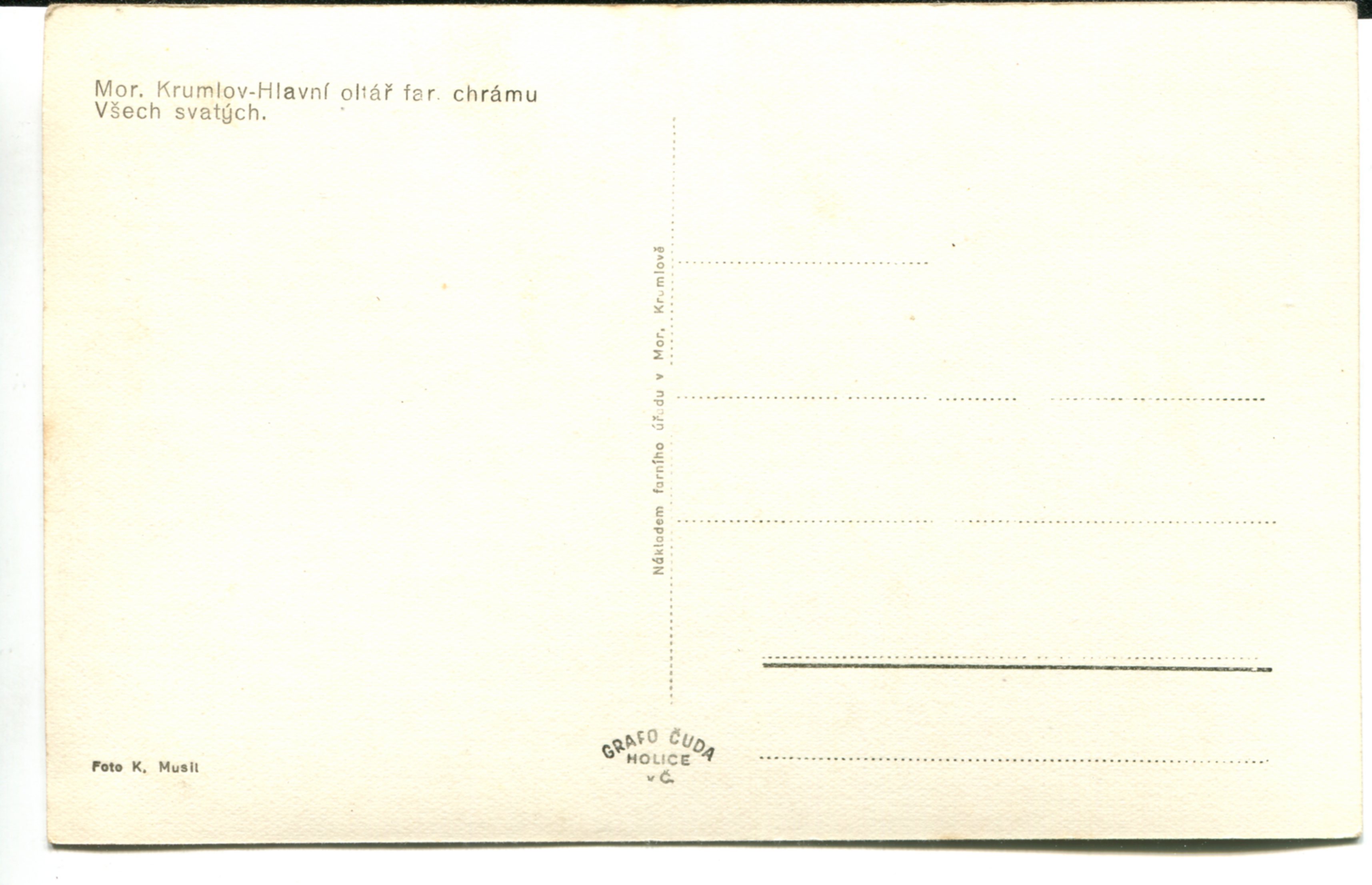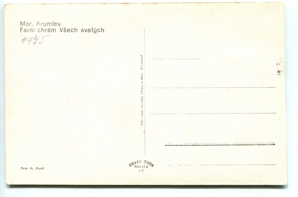 Zadní strana (Obr.č.29): Nákladem farního úřadu v Mor. Krumlově Grafo Čuda Holice v Č. Foto K.Musil