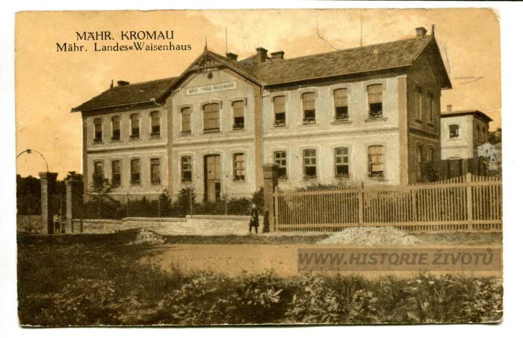 Přední strana: Nápis: „Mähr. Kromau Mähr. Landes=Waisenhaus“ (Moravský zemský sirotčinec)