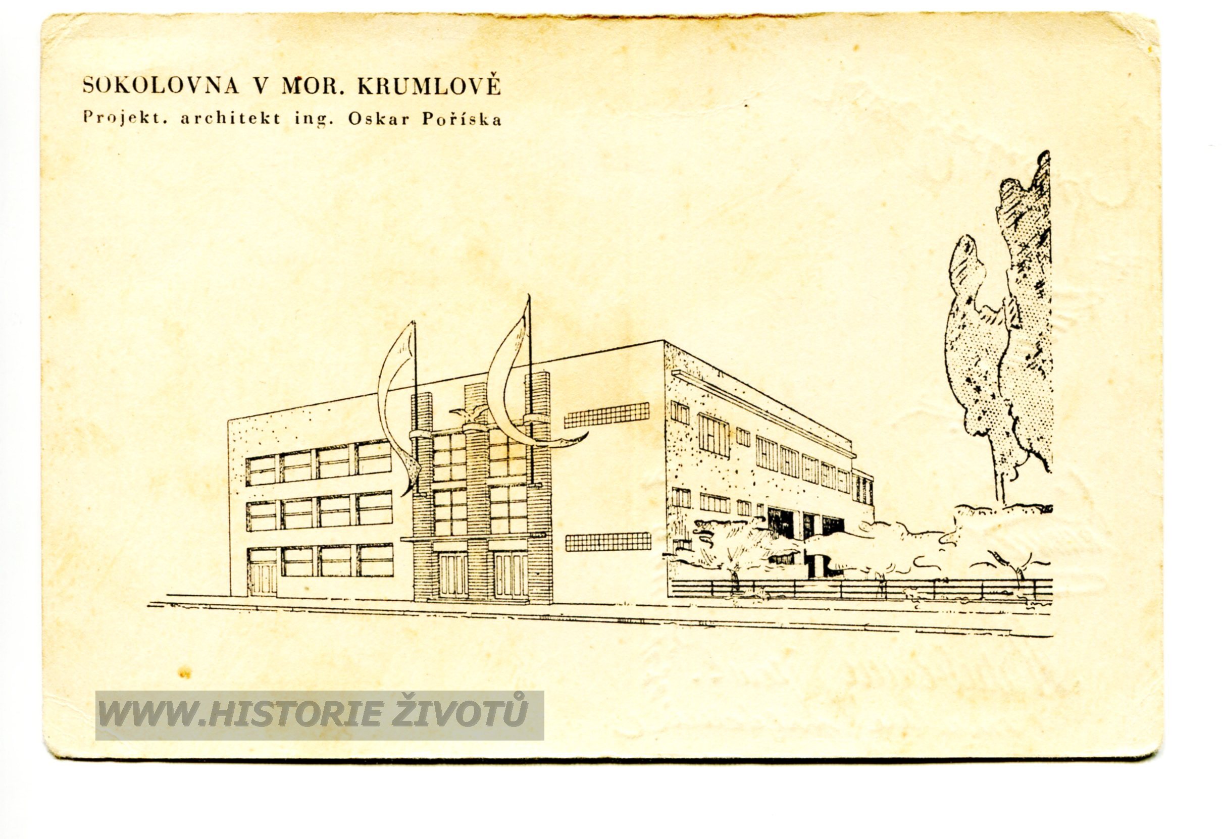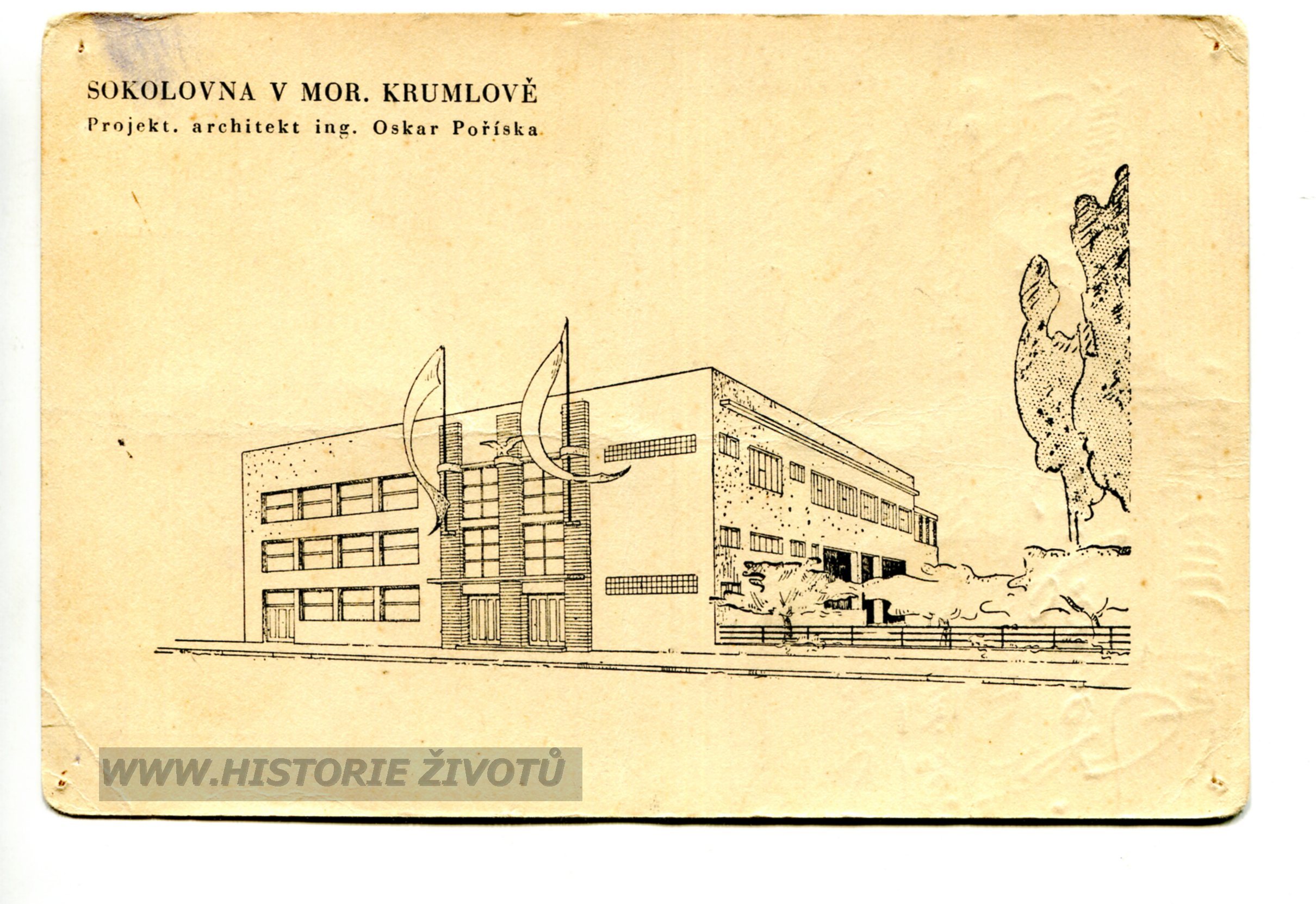 Přední strana: Nápis: Sokolovna v Mor.Krumlově Projekt. architekt ing. Oskar Poříska