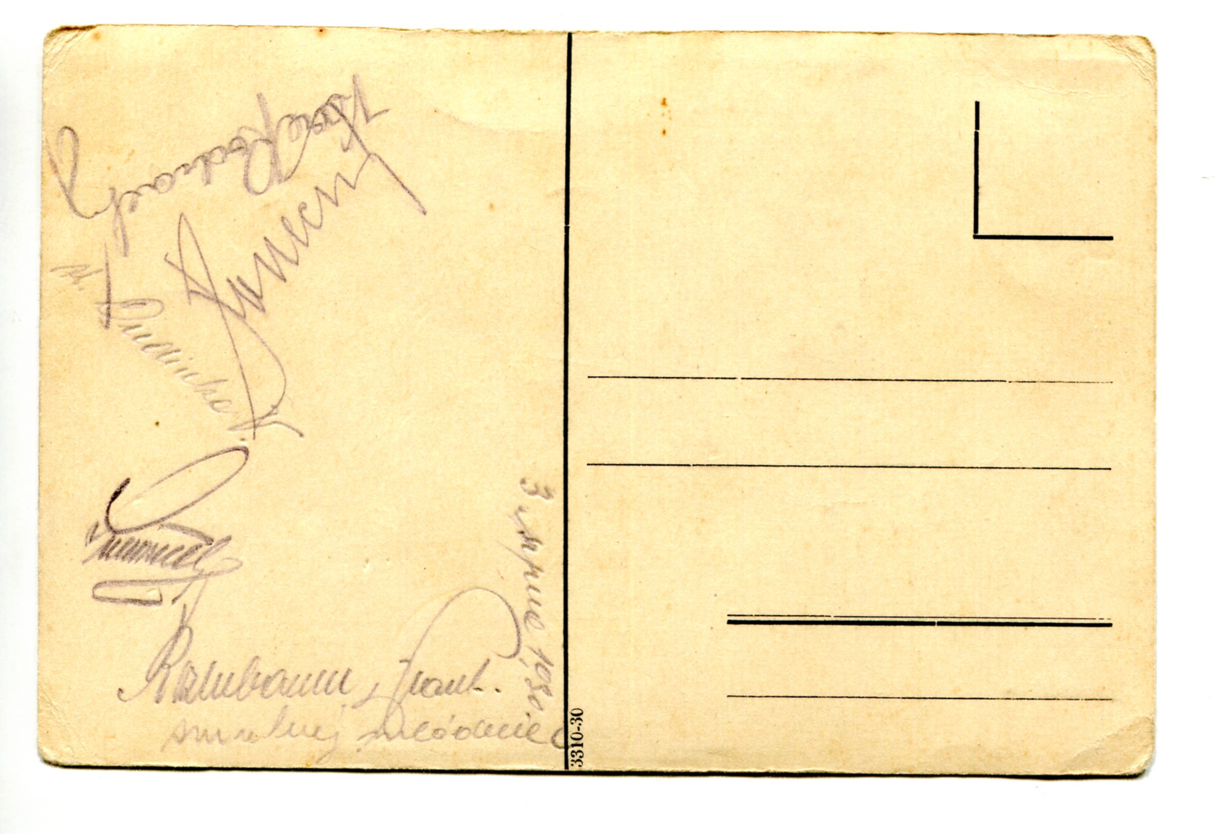Zadní strana (Obr.č.33): Rukou je napsáno: 3. srpna 1930 a 5 podpisů (Ros(z?)enbaum Frant., smutný mládenec, ? Dudinka ?, Konečný, Karel Podracký, ???urnický)