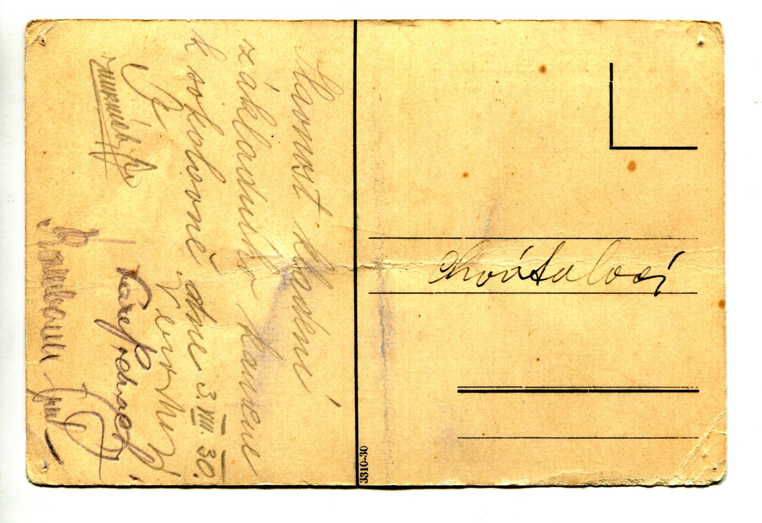 Zadní strana (Obr.č.35): Rukou je napsáno: Slavnostní kladení základního kamene k sokolovně dne 3.8.1930 a 4 podpisy (Verostová, Karel Podracký, Ros(z?)enbaum Frant., ???urnický).
