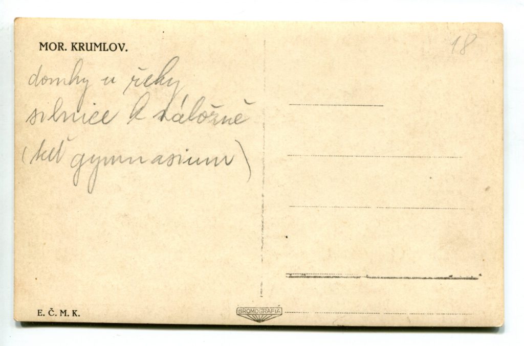 Zdůvodnění: Na jaře 1931 vydal starosta Mor.Krumlova Kašpárek oznámení o veřejné soutěži na stavbu Masarykovy živnostenské školy pokračovací a začala její výstavba, na pohlednici jsou však původní domky. V roce 1919 se do MK přistěhoval Em. Černý