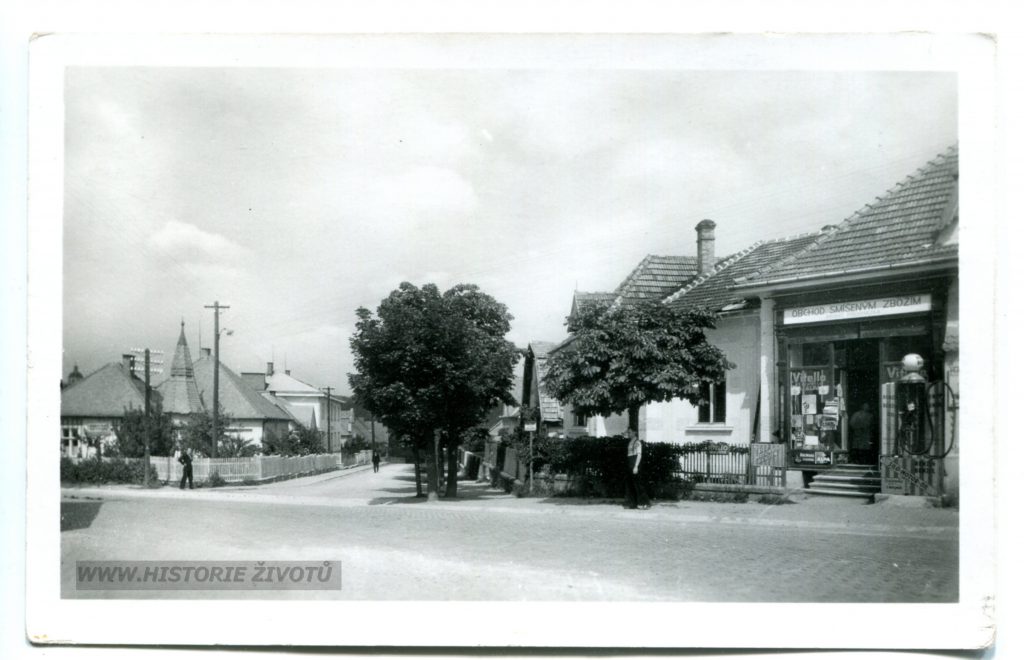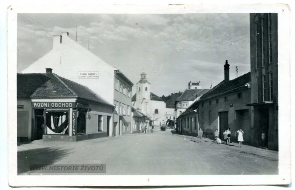 Zdůvodnění: Vpravo je Vaďurův dům již s nadstavbou (1932), vzadu je budova Okresního hejtmanství s 2.patrem (1937), Módní obchod vlastnil Jaroslav Růžička, který se přistěhoval v roce 1934 a odešel z města ještě před okupací. Další dům č.p.149 (41/I) byl postaven v roce 1937. Na jeho zdi je reklama Oskara Andrese, který zde měl před válkou ordinaci. Většina domů v ulici byla vybombardována v roce 1945, u klášterní zahrady je vidět oblouková zeď.