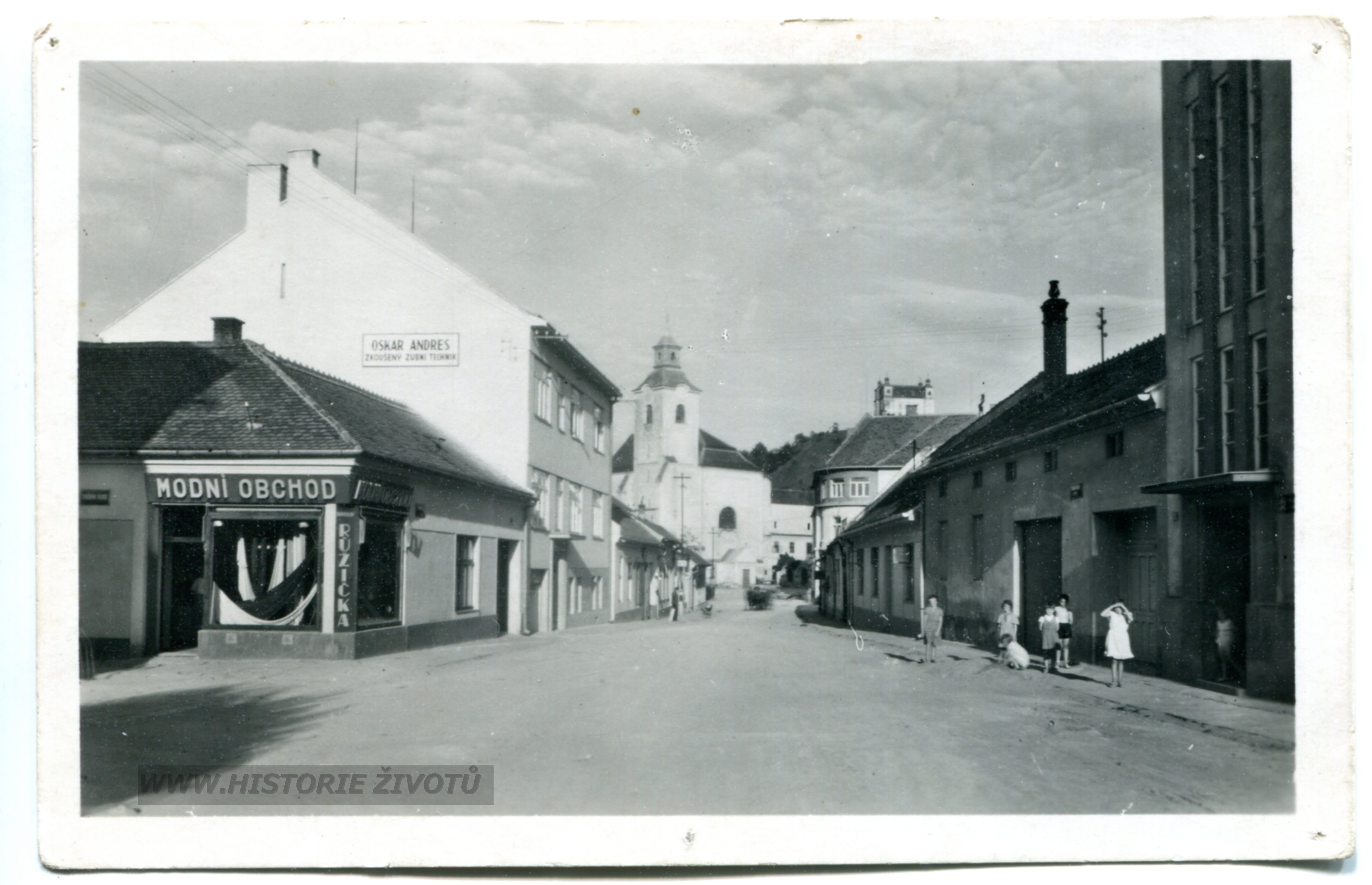 (Na obdobné pohlednici Komenského ulice z období okupace, nalezené na internetu, je poznat na zdi domu 41/I místo, kde byla Andresova reklama; místo Módního obchodu je papírnictví Josefa Blahetka, které v této budově provozoval přes válku)