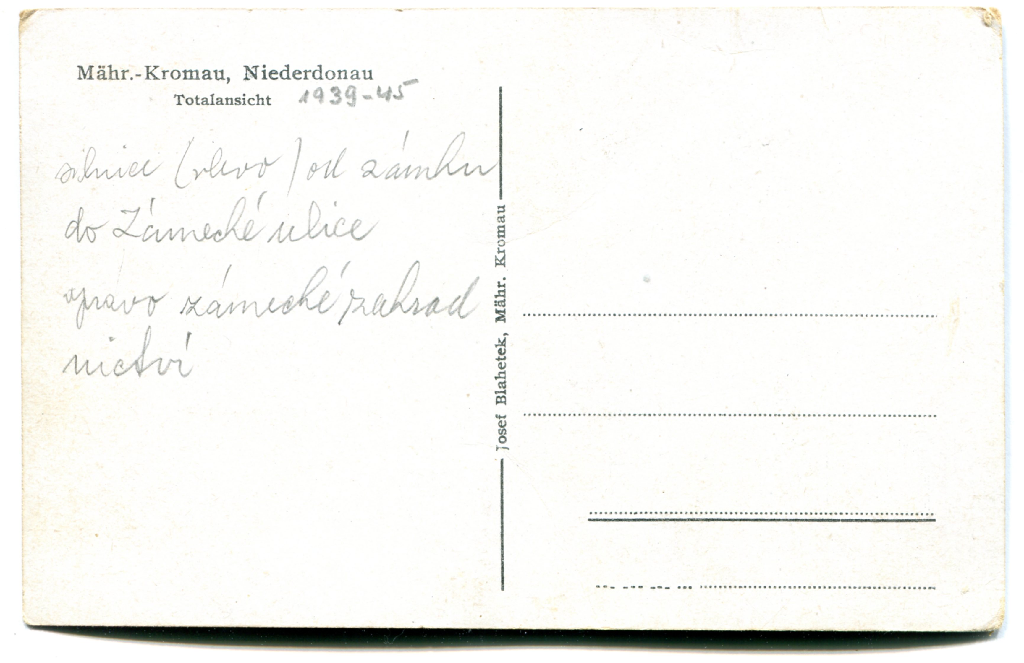 Zadní strana (Obr.č.49): „ Mähr.-Kromau, Niederdonau Totalansicht“ Josef Blahetek, Mähr. Kromau