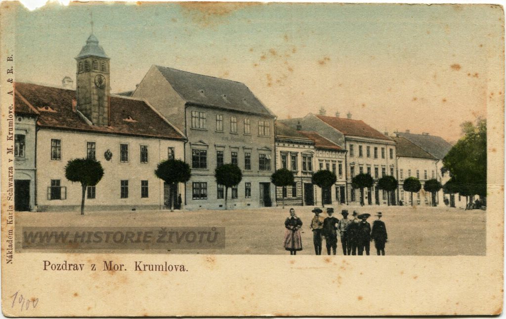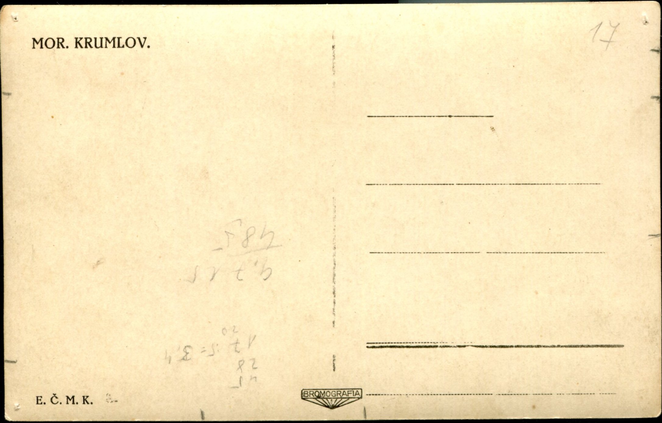 Přední strana: Nápis: „Pozdrav z Mor. Krumlova“ Nákladem Karla Schwarza v M. Krumlove. A & R. B.