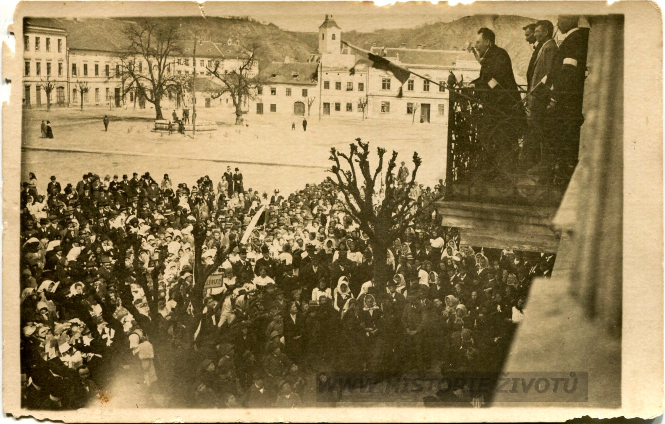 Zdůvodnění: Velice pravděpodobně je na fotografii zachyceno vyhlášení nezávislosti na Rakousku-Uhersku v Mor.Krumlově v roce 1918. K tomu jsem došel na základě toho, co je vidět a co uvádí Krumlov před léty: „1. patro domu (99/I) bylo nad dveřmi uprostřed osazeno balkonem, ze kterého byla v r. 1918 v M. Krumlově vyhlášena nezávislost na Rakousku-Uhersku“.