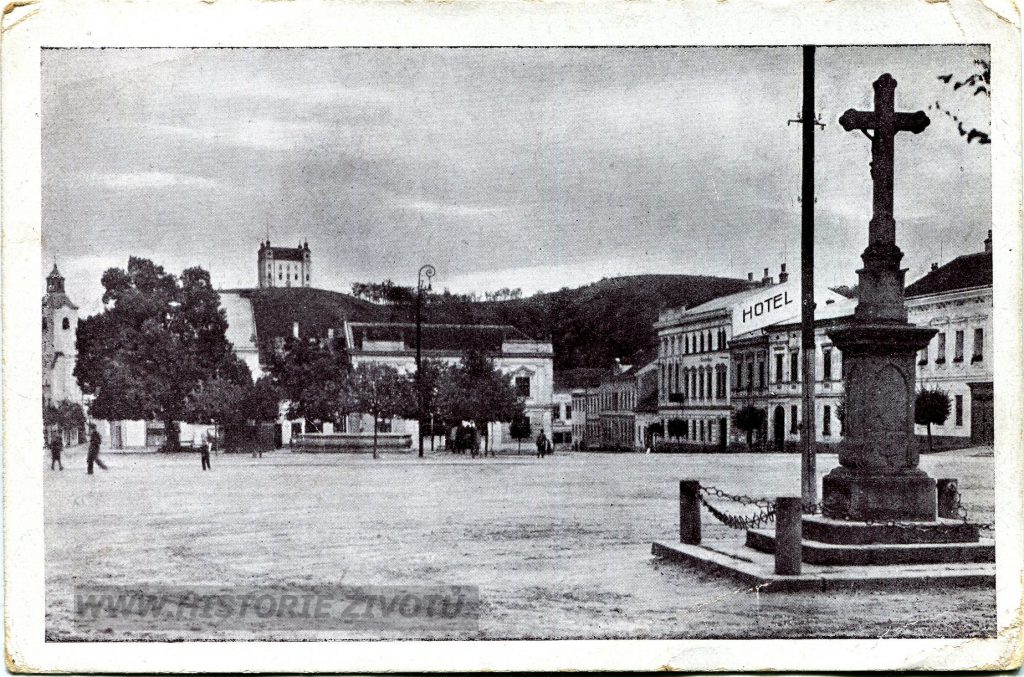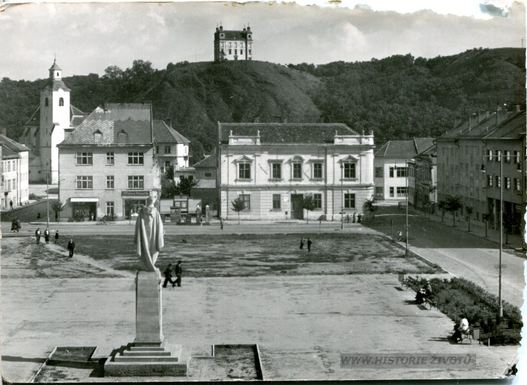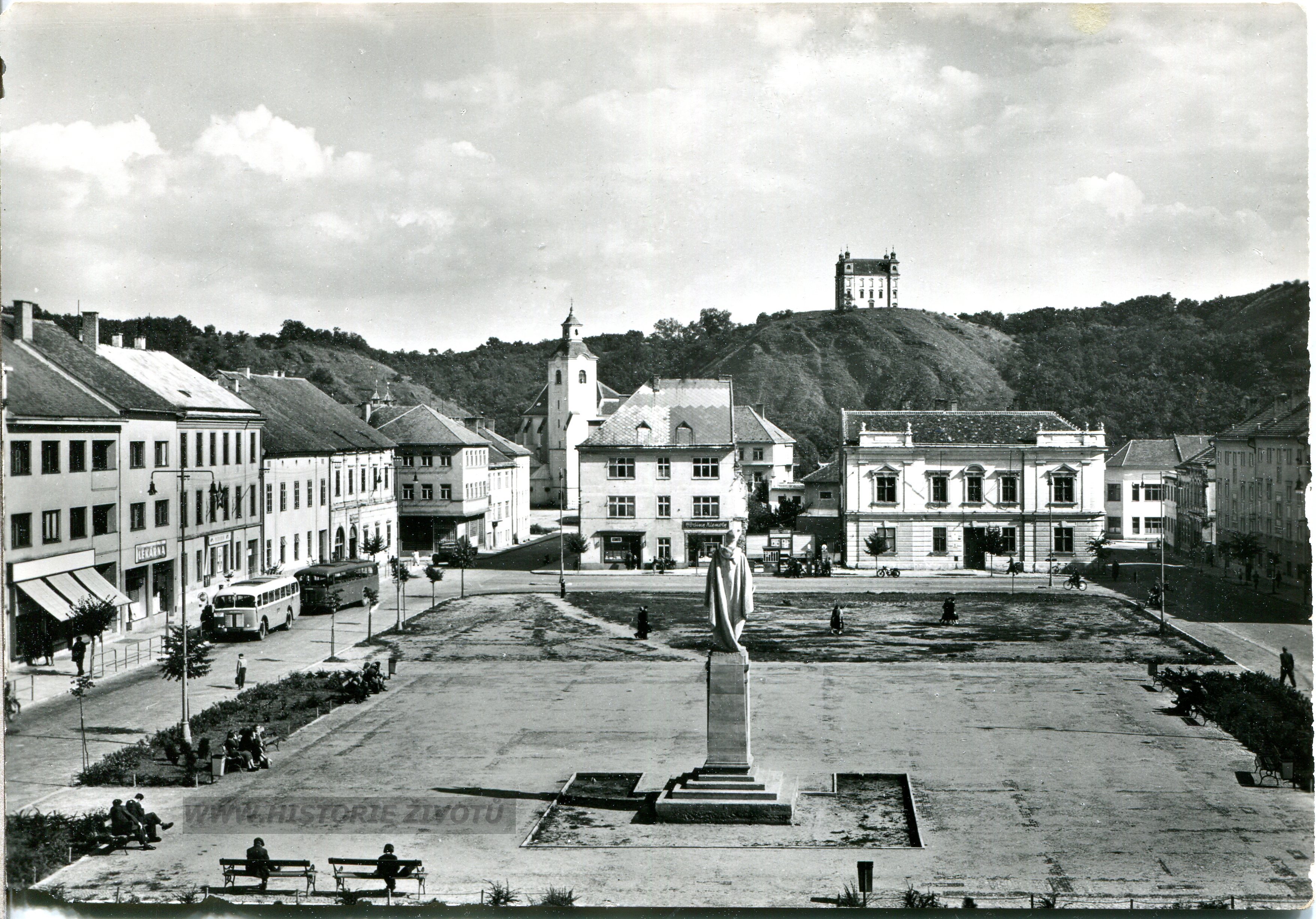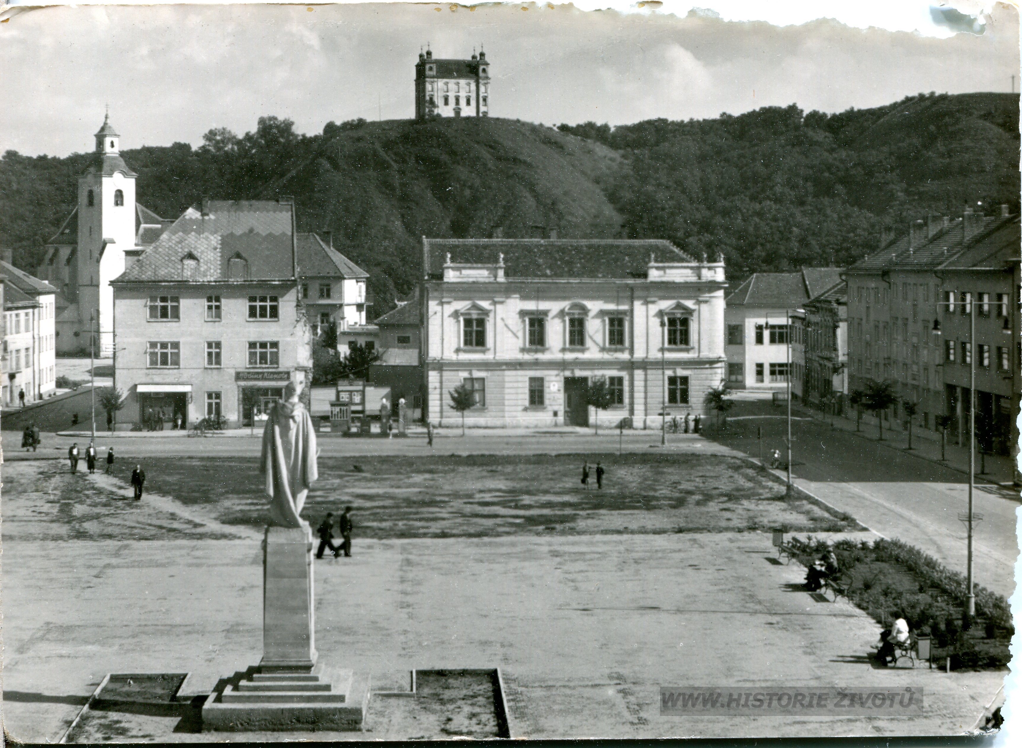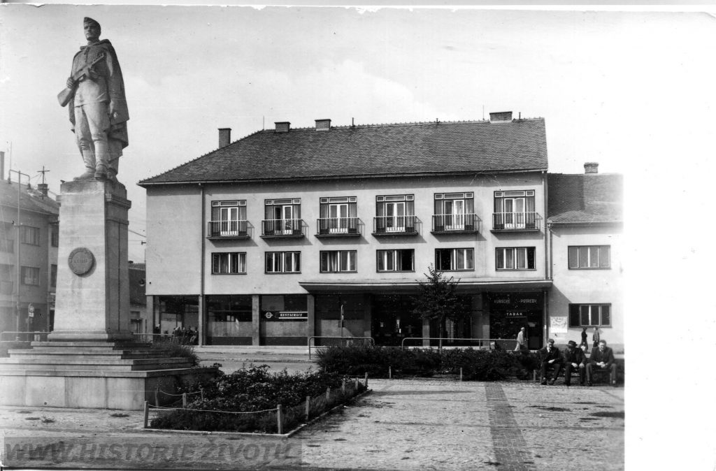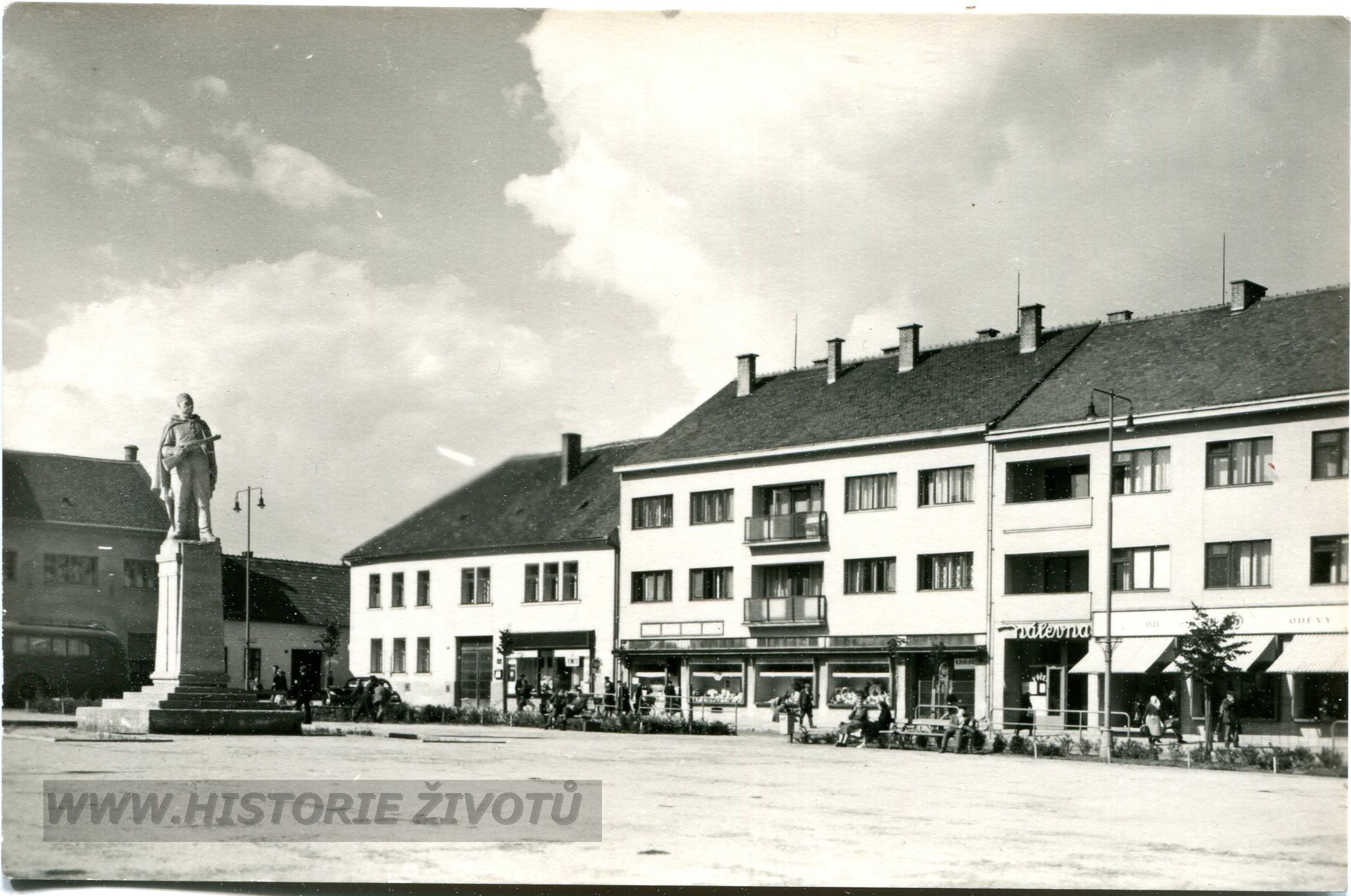 Zdůvodnění: je dokončena stavba velkého domu č.p. 44-45 na severní straně náměstí, kde byla restaurace, obuv, elektroprodejna aj. (listopad 1949), hotelu (léto 1950), dosud není socha rudoarmějce (9.5.1953)