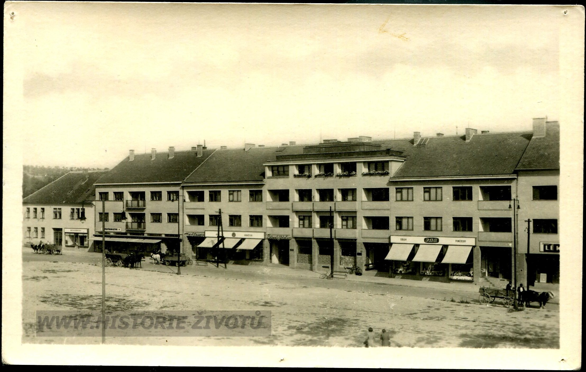 Na domě č.p.45 jsou nápisy „Nálevna“, „Oděvy“, „Lidová jídelna“ a „Obuv-Jas-Punčochy“.