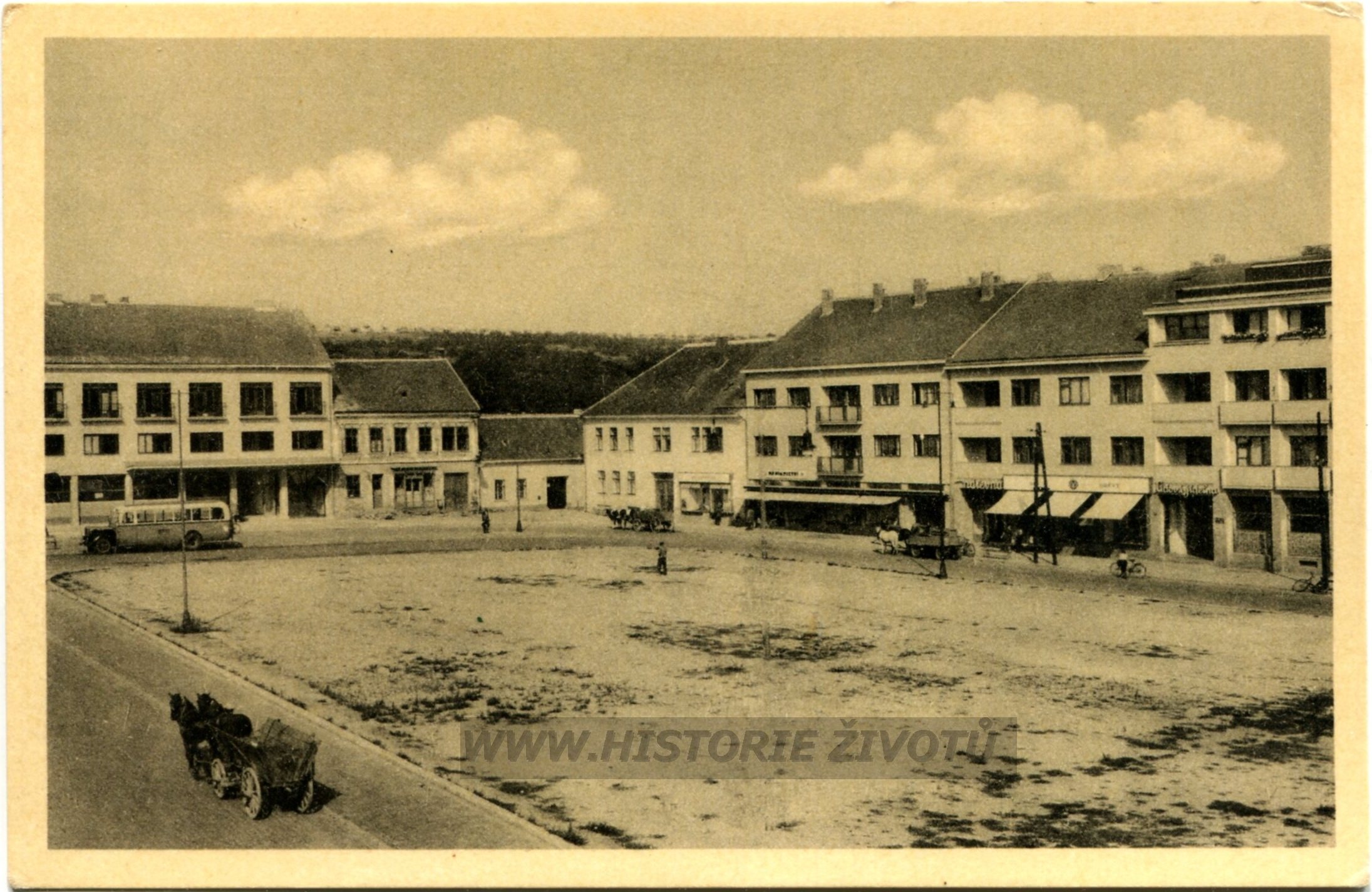 Na Obr.č.76 je vidět autobus, který v té době jezdil mezi náměstím a nádražím ČSD. Na náměstí v té době běžně jezdily koňské a kravské povozy, kromě autobusu není vidět žádné motorové vozidlo.